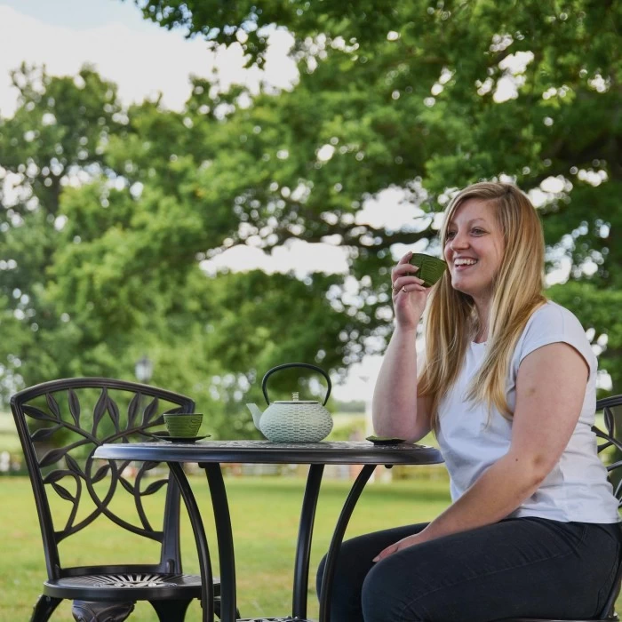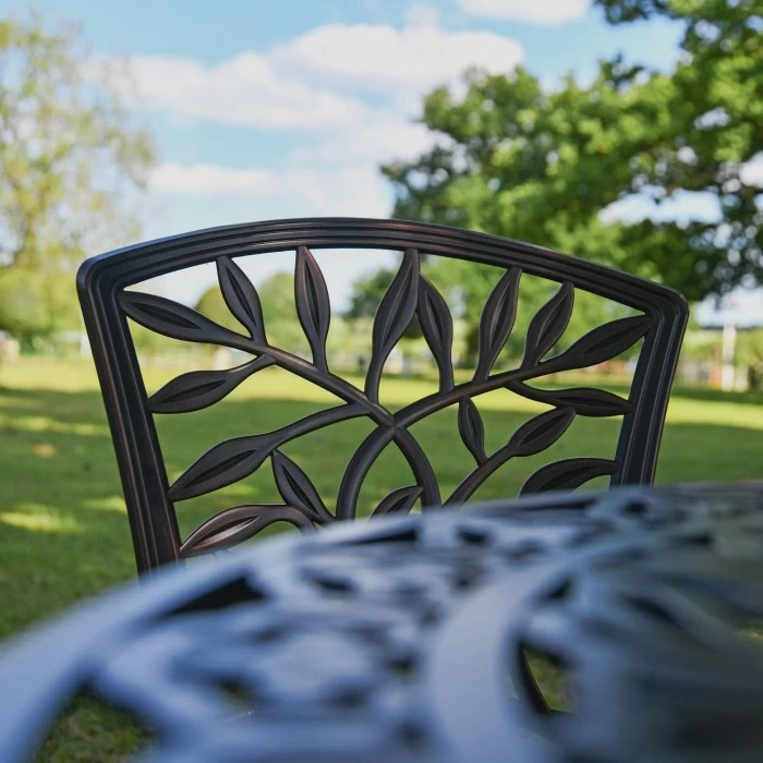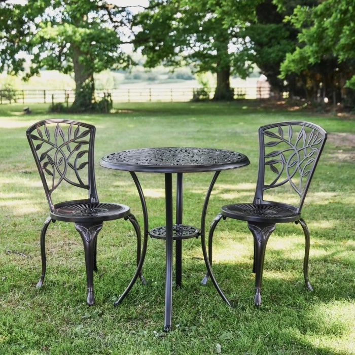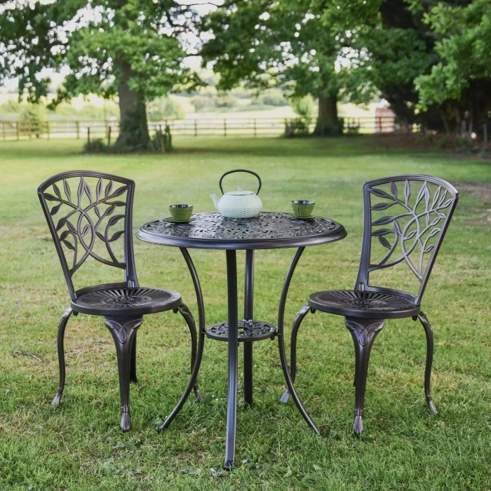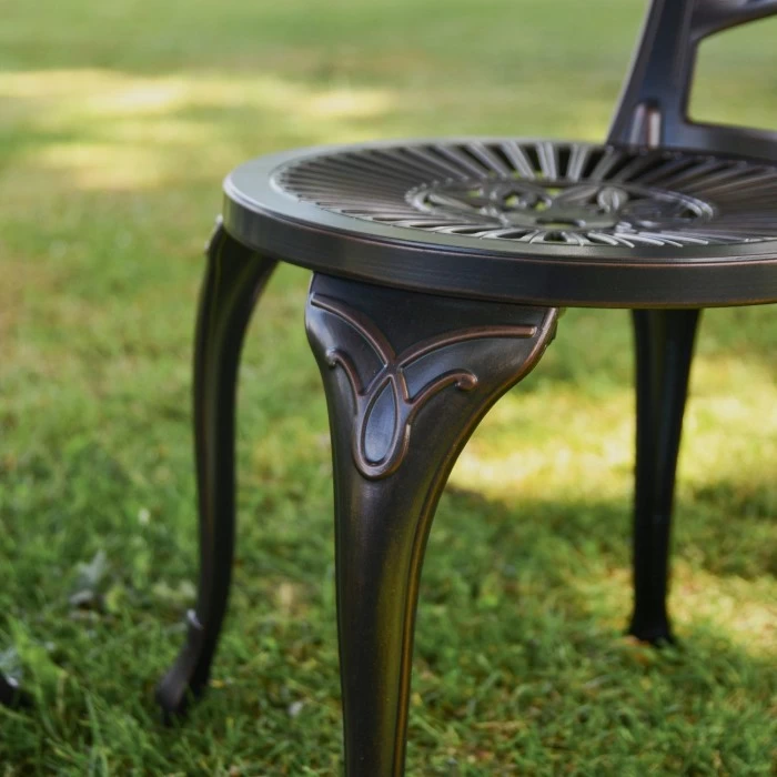 Made from high quality aluminium and finished to an expertly quality in a smooth copper finish, this beautiful two seater outdoor table and chair set is the perfect accessory for any garden space. Designed with ornate floral detailing on the chair’s backrests with the seats having a central floral motif surrounded by slatted detailing, this garden furniture set is ideal when placed on patios, in gardens and on balconies. The three legged table has an integrated two tiered base for increased support and stability during use. The patterning on the table includes cut out detailing, adding a sophisticated look to the overall piece.