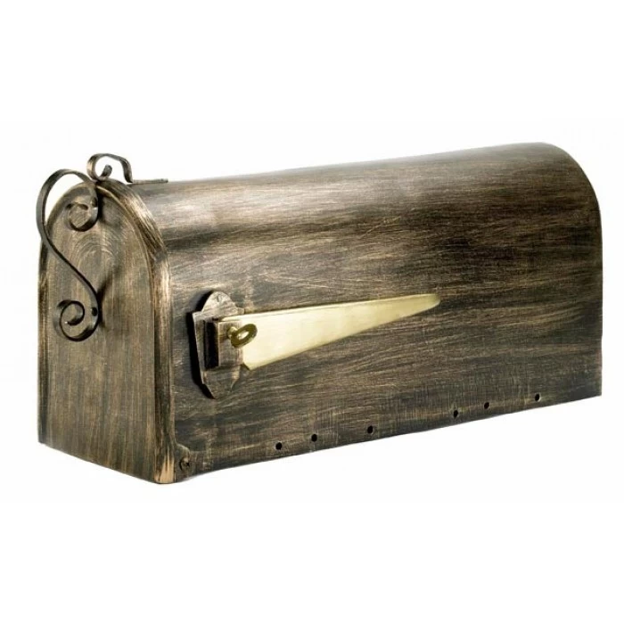 This handmade mailbox has been crafted from galvanised steel and is a delightful nudge towards classic American styling. Finished in a rustic brown brushed in gold undertones, this mailbox creates an alluring retro feel. With gold detailing in the twirled handle and working traditional flag, this mailbox is the perfect product for that âyouâve got mail!â moment.