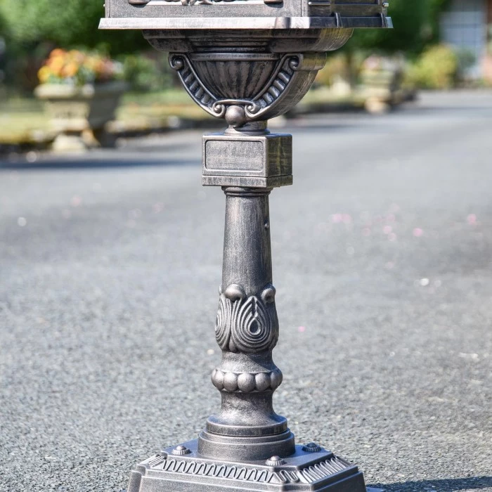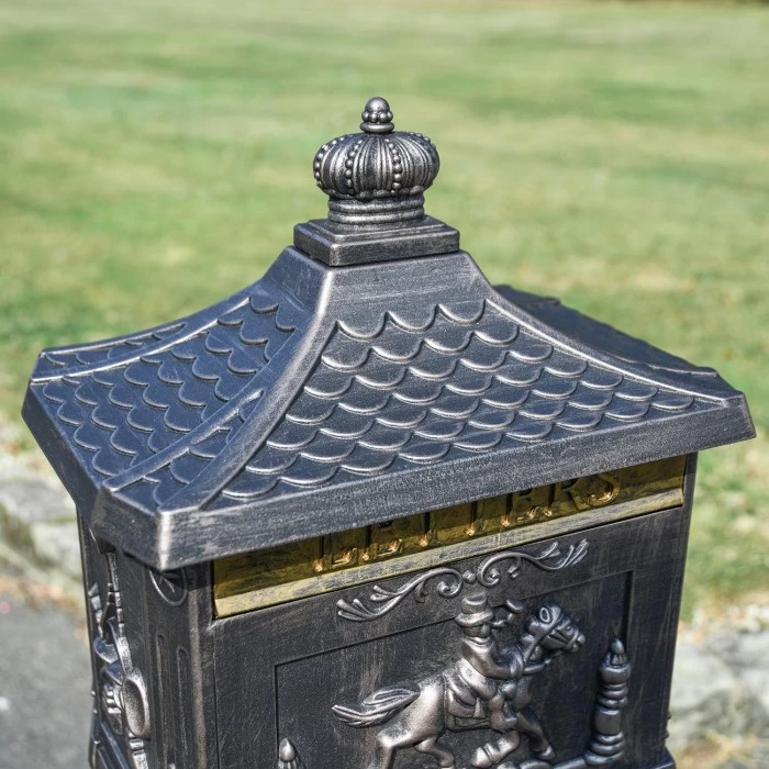Set on a turned pillar, this post box has a striking and period look with a detailed and sculptured top box, all set on a splendid column. Cast in aluminium, the Huntingdon is a new addition produced with a brass letter flap and striking black finish and detailing.Ā