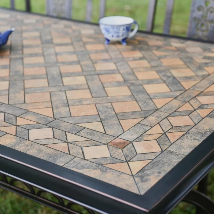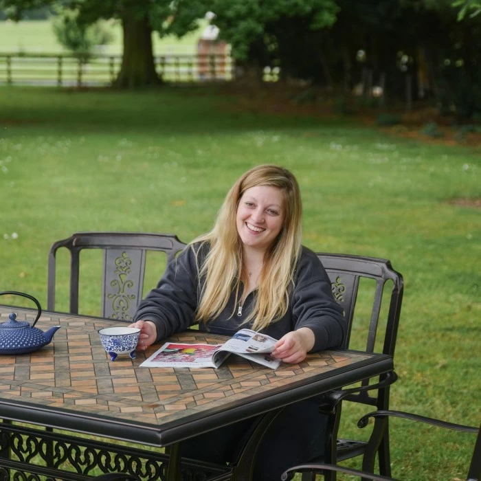 Invite the whole family for brunch with this gorgeous aluminium and ceramic garden furniture set. The rectangular heavy duty table combines aluminium legs and supporting braces with a ceramic tile table top, giving a smooth and sophisticated look to the overall set. The six accompanying chairs each have cut out filigree detailing on the backrest and a woven type pattern on the seat for comfort and support. Its simple but elegant design means this furniture set will look perfect in any garden setting.