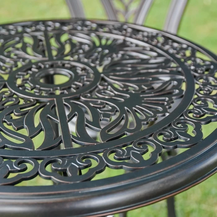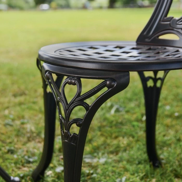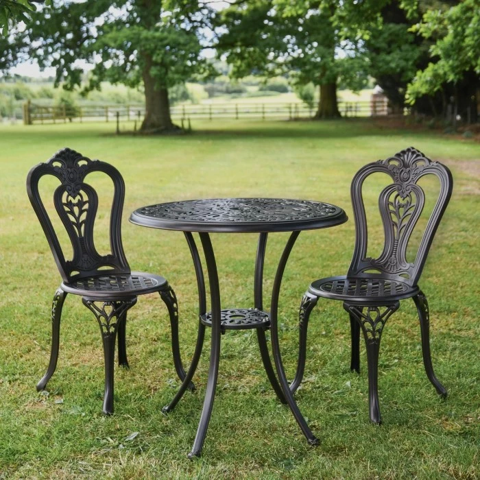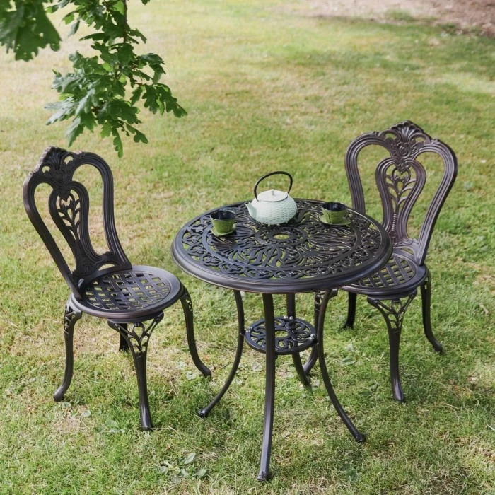 Add elegant style to your garden or patio with this fantastic two seater garden furniture set. Created and crafted from robust aluminium and finished in an antique copper finish, this set is perfect for couples in all garden locations. The two chairs are elaborately styled with open backs and filigree detailing, whilst the chair seat has a lattice pattern for comfort. The circular table features three legs and two tiers for maximum stability and support during use, and the filigree design matches the chair backrest.Â