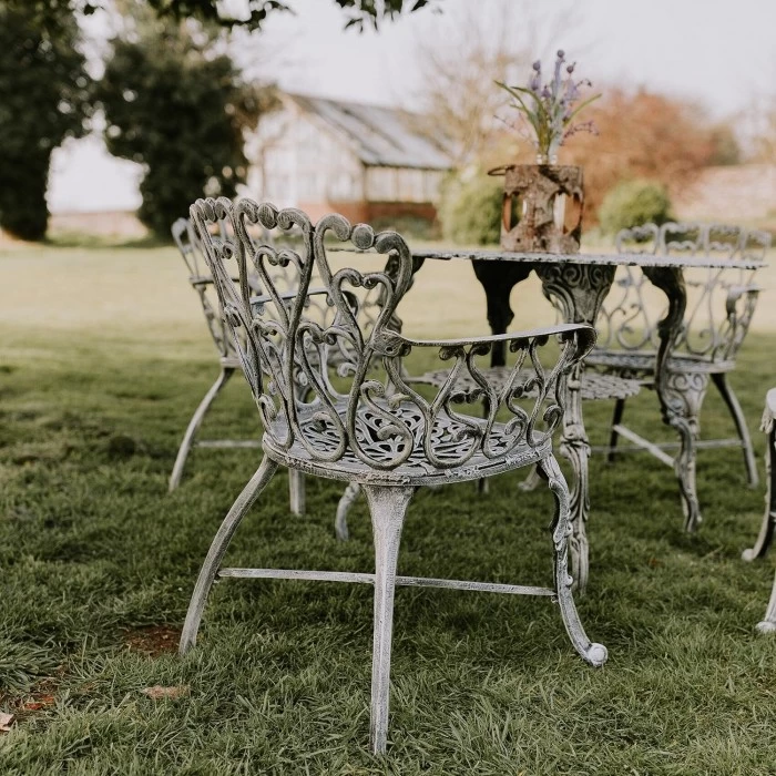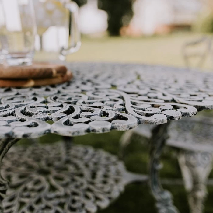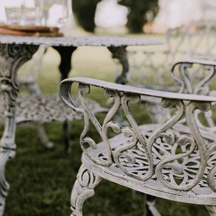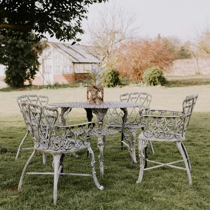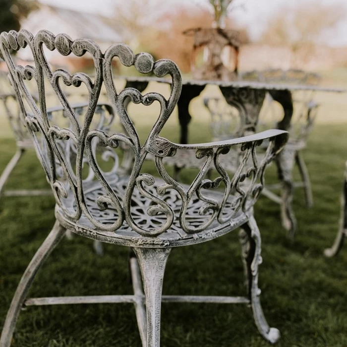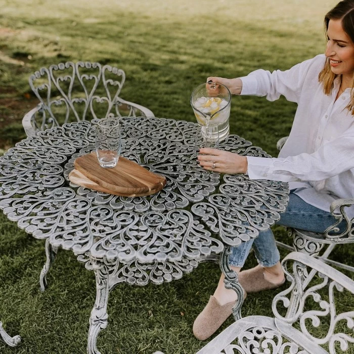 Add a touch of sophistication and elegance to your garden with this four seater dining set. Crafted from high quality robust aluminium and finished in a unique antique cream finish, this table and chair set features gorgeous heart and scroll detailing throughout. The table comprises of three slightly curved legs for stability and support during use, whilst the second tier allows for tired legs to be rested on. The matching four chairs feature matching chair seat bases and large heart chair backrests which add a romantic aesthetic to the overall piece. A must have during the spring and summer months.