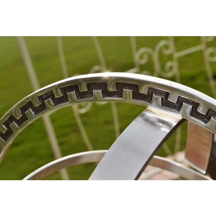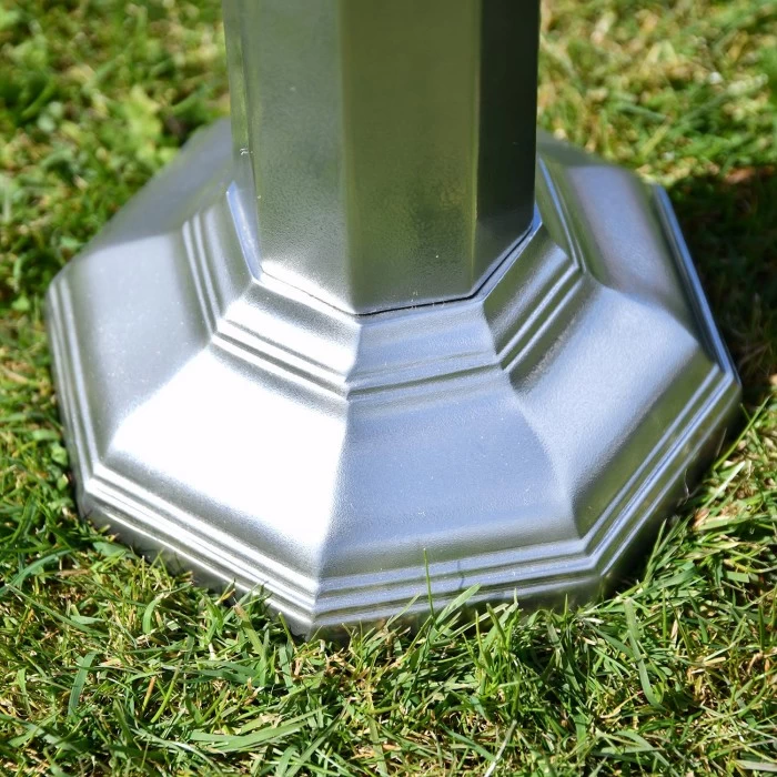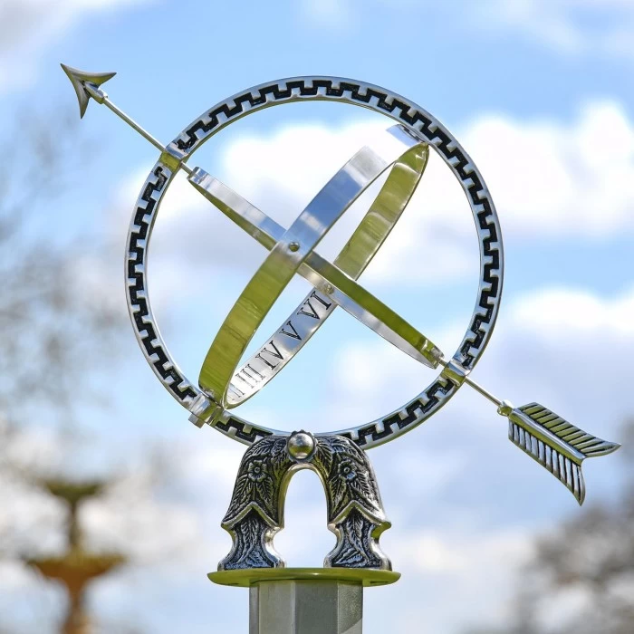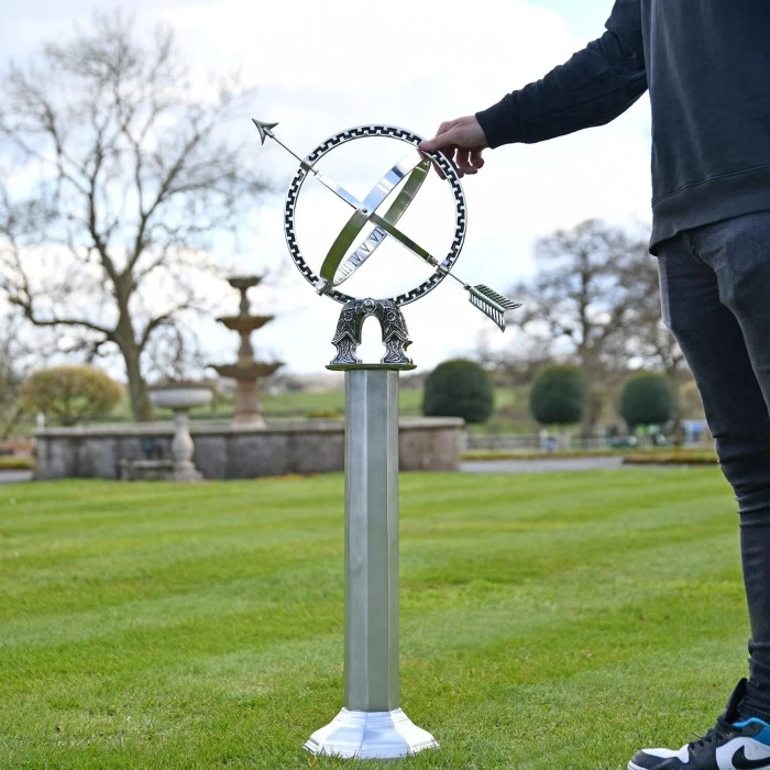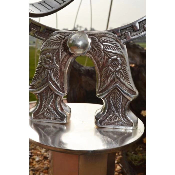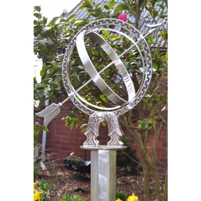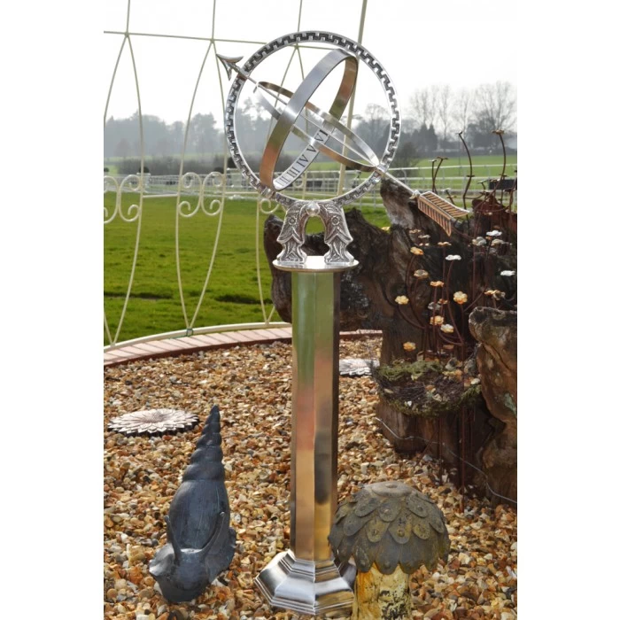 This regal cast aluminium armillary comes complete with the matching column, making it ideal for placing directly into position. Crafted from cast aluminium with a beautiful polished antique silver finish, the reverse of the embossed detailing has been handpainted in a midnight black finish, which will highlight each part of the armillary, giving both depth and added decoration. Please note, that this item is designed to be used both outdoors and indoors or under covered areas, including conservatories and orangeries. If placed outside, weathering will occur. We therefore recommend reguarly coatings of yacht varnish to preserve the polished effect. Â