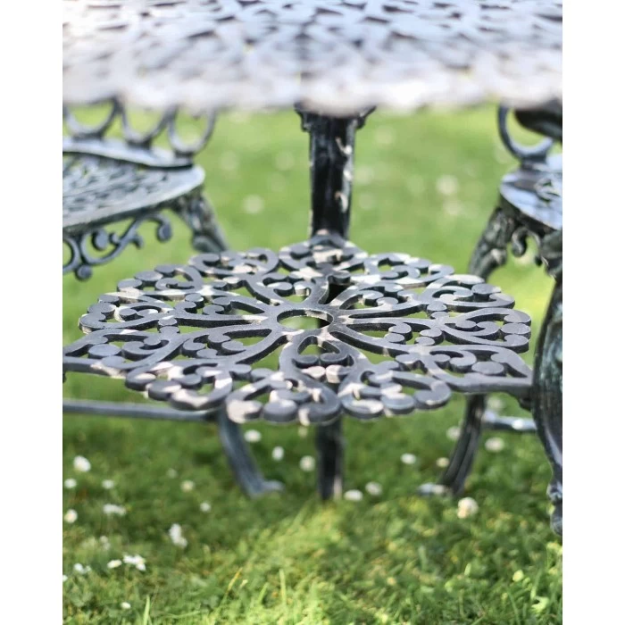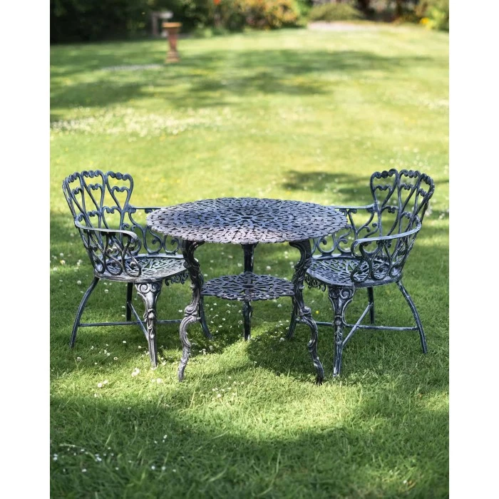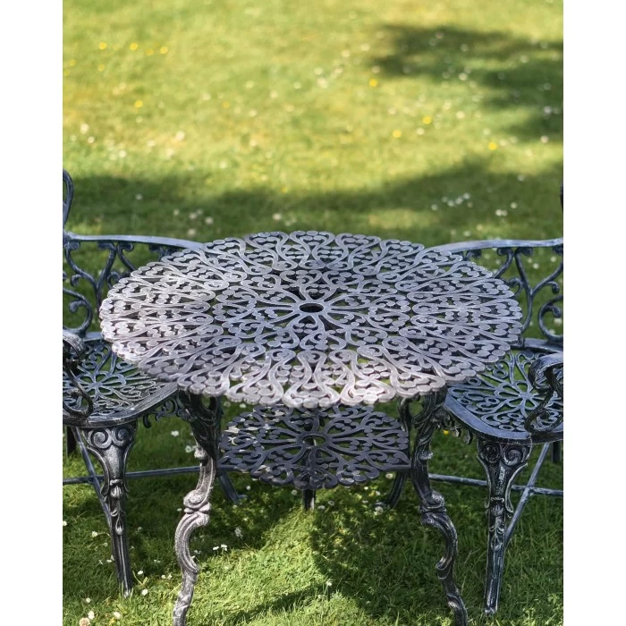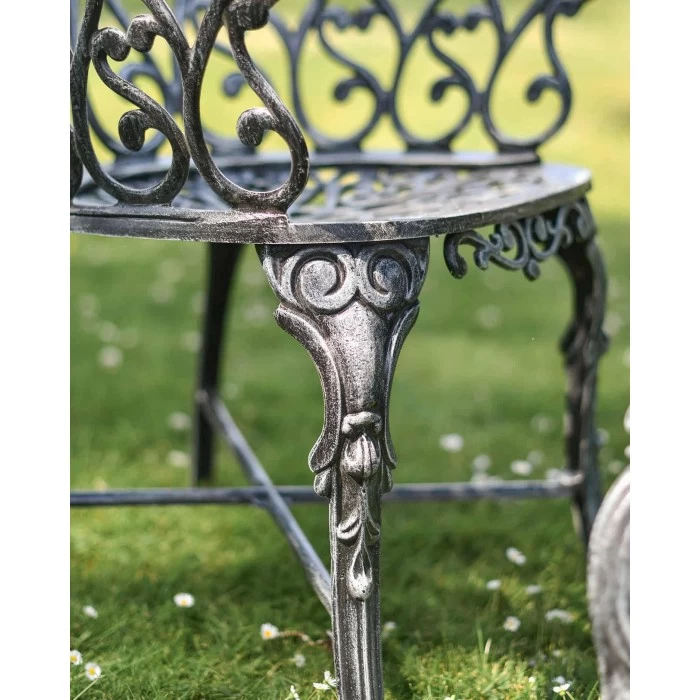 Show off some class and elegance with our “Ascott” range of two-seater garden table and chair bistro sets. Made from high-quality recycled cast aluminium, this outdoor bistro set is complete in an antique silver finish. With a stunning design offering expert cut-outs to highlight the free-flowing ‘heart-shaped’ motifs across the chair backrest, flowing effortlessly to the armrests. This design is followed across on the single circular table, this symmetry and consistent craftmanship complete the set; with three legs connecting to the table, this provides essential support to provide a stable and secure product. A must-have for those upcoming summer months!