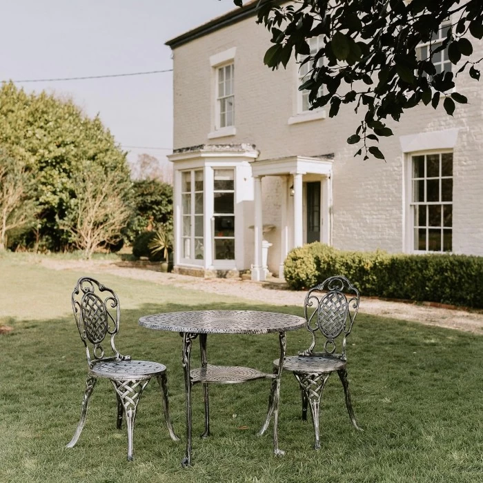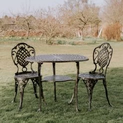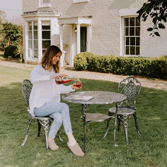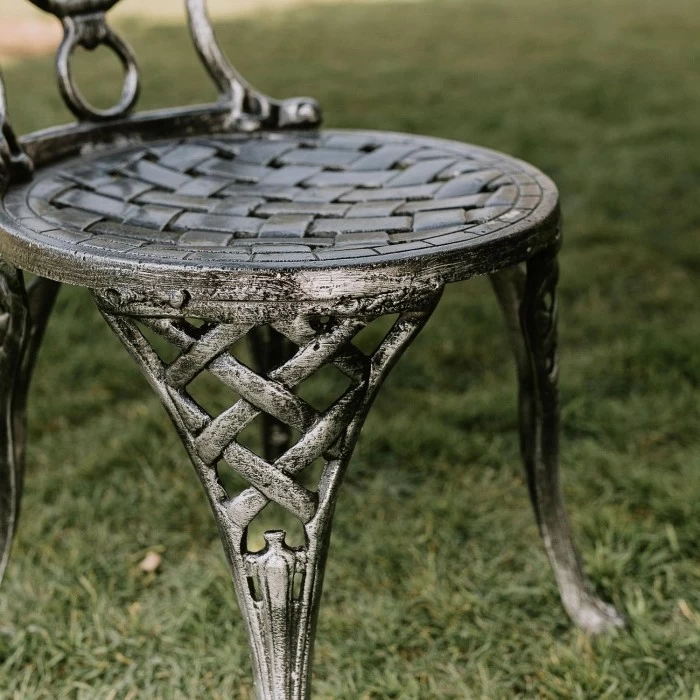 Finished in an antique silver finish, this gorgeous and simply breath-taking bistro dining set consists of a circular table and two matching chairs. Crafted from high quality aluminium, the intricate lattice design features throughout, from the central table design, to the backrest and seat on the chairs. With slightly curved legs on the chairs, it gives it a romantic feel which complements the scroll detailing on the chair backrest. Simply place directly on the grass or on patios and sit back and relax.