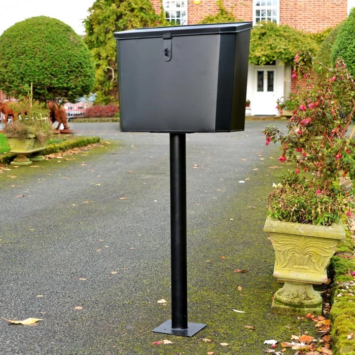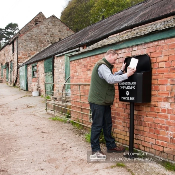 This parcel box is fabricated from heavy robust galvanised steel sheets which have been shaped and contoured into an attractive design and topped with a hinged lid. Personalisation on this postbox is available (as shown) which is ideal for displaying your house name or number. The box comes with a built in clasp and staple which can be secured with a padlock. This postbox can either be left free standing or fixed to a wall. The additional option of a heavy duty steel column is also available for added security where a wall fitting option is not available.Â
