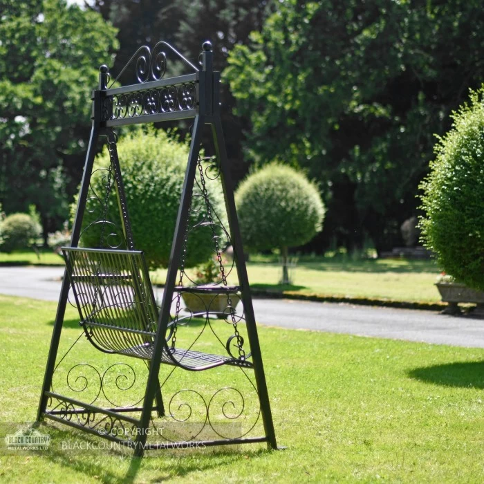 Featuring scroll detailing throughout, this beautiful two seater swing seat has been created from high quality steel and finished in a midnight black finish. Hung between two A-framed structures, each of the feet have pre-drilled holes allowing the swing to fix into place with ease ensuring stability and comfort throughout the year. Two half moon shelves are at either side allowing for drinks and nibbles to be in arms reach. All you have to do is simply add plush cushions and a blanket for added comfort and experience full relaxation in the privacy of your own garden.