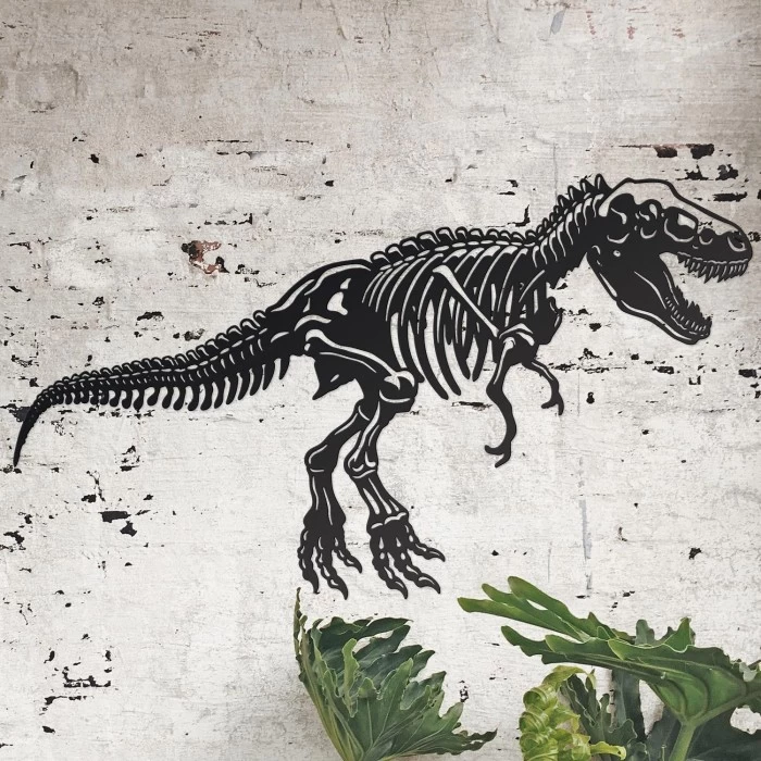 Crafted from high quality steel and finished in a sleek midnight black powder coated finish, this large T-Rex wall art will certainly add character and fun to your home or garden. Designed to be wall mounted either indoors or out, this wall art features a skeleton version of the famous short armed mammal. Highly detailed from nose to tail, each bone can be seen adding to its overall style and shape of the piece. A fantastic gift or accessory for film and movie fantastic, dinosaur obsessed kids or adults and those who simply love to have something out of the ordinary.