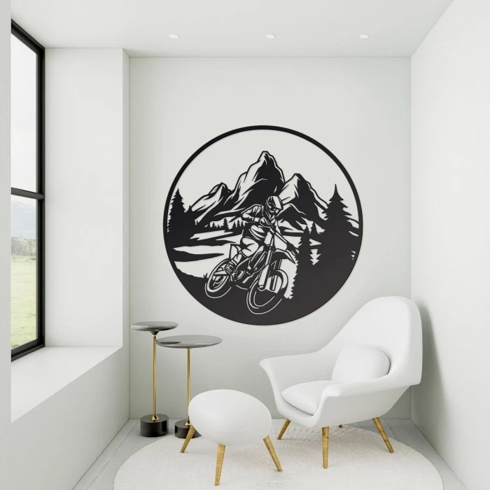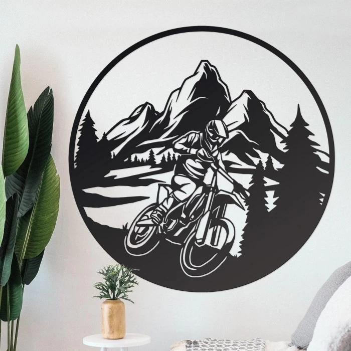 For the motocross enthusiast or outdoor dirt bike adventure lover, this wall art is the ideal gift. Crafted from robust steel and finished in a beautiful and sleek midnight black finish, this wall art will complement both indoor and outdoor areas with ease. This circular wall art depicts a motocross rider with a mountainous and alpine tree scene behind him. Completed with pre-drilled holes, this wall art can be hung in bedrooms, man caves or commercial spaces.