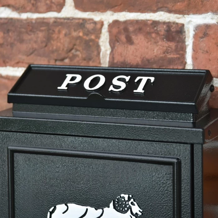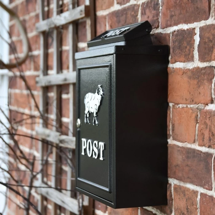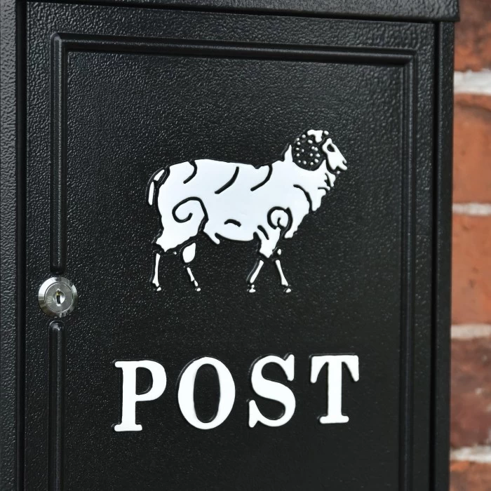 Our “Oxford Down” Post Box is manufactured by hand using galvanised steel and hand cast aluminium detailing to the door and letter flap. All finished in a hardy black powder coat paint with a white, hand-painted Oxford Down sheep motif.