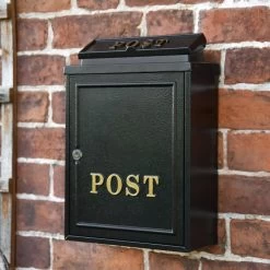 Our Gold Detail “Oxford” Post Box is manufactured by hand using galvanised steel and hand cast aluminium detailing to the door and letter flap. All finished in a hardy black powder coat paint with hand painted gold detailing.Â