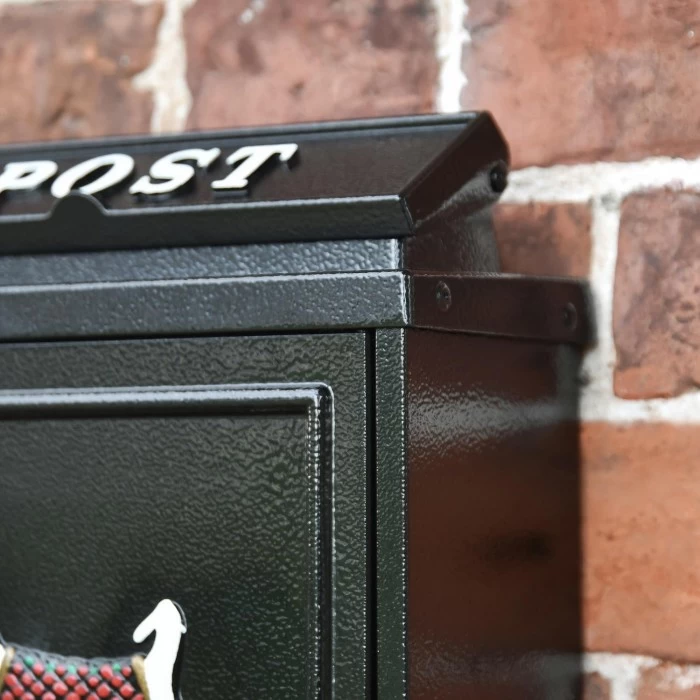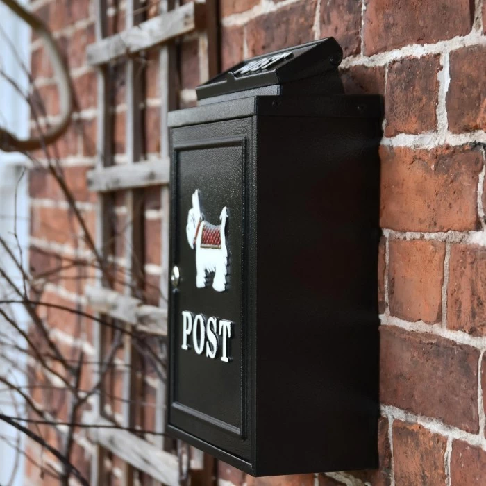 Our Black “Oxford” White Westie Post Box is manufactured by hand using galvanised steel and hand cast aluminium detailing to the door and letter flap. All finished in a black powder coat paint with a black and white, hand-painted West Highland White Terrier motif, featuring an iconic tartan jacket.
