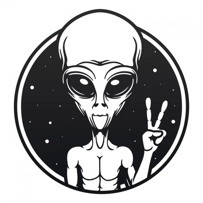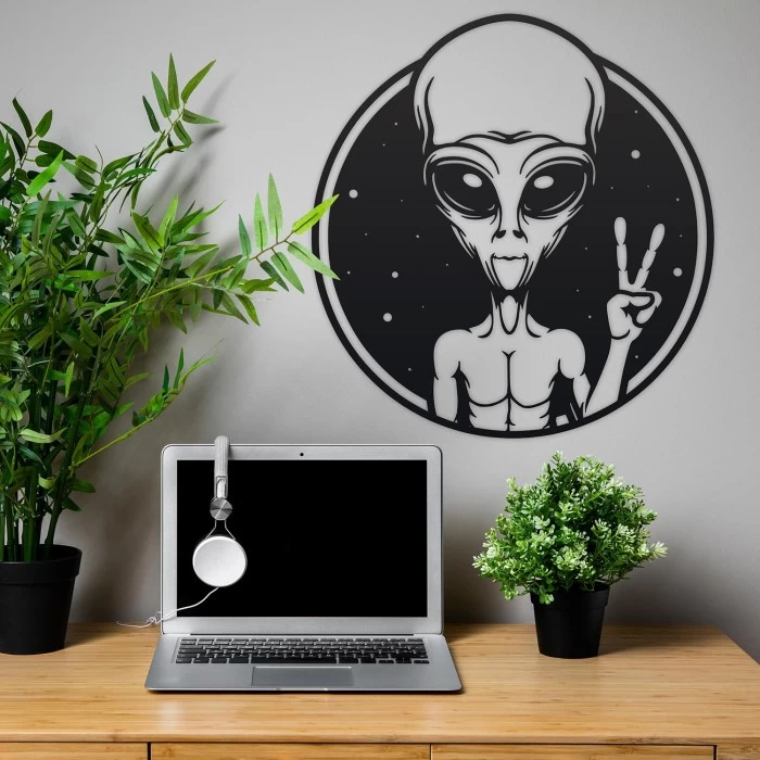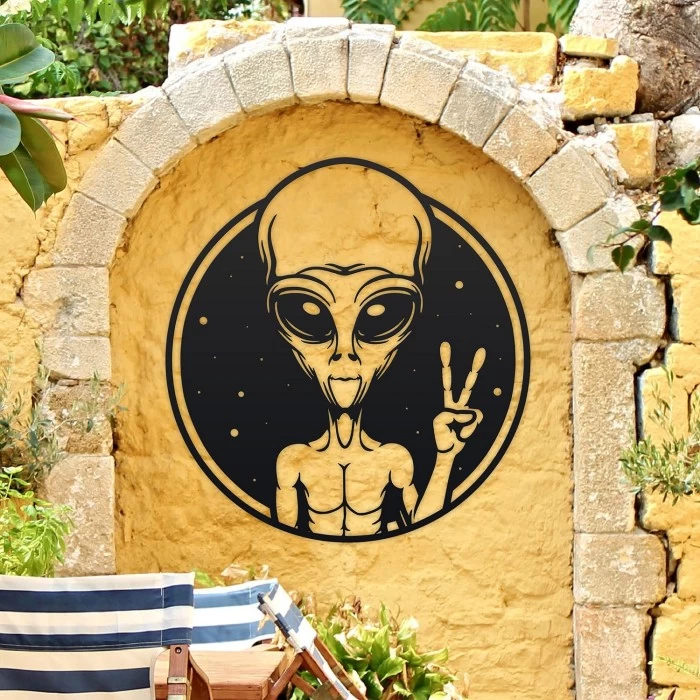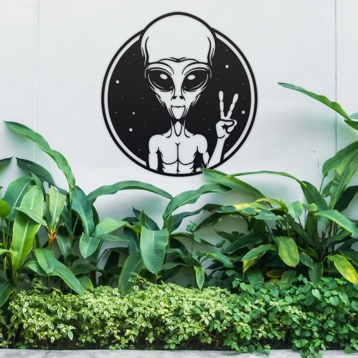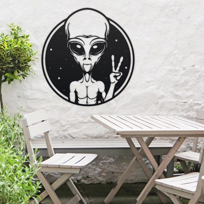 Crafted and designed by our in-house creative team, this wall art is ideal for movie and sci-fi fantastic and lovers. Created using high quality steel and finished in a powder coated sleek midnight black finish, this wall art depicts an alien throwing a peace sign with his two fingers. Created into a circle, behind the alien is a space like background adding to the theme of the overall piece. Highly detailed throughout, this wall art would look best when placed on painted wall backgrounds and natural brick work. Able to be placed both indoors and outdoors, this wall art will certainly add fun and character to your desired area.