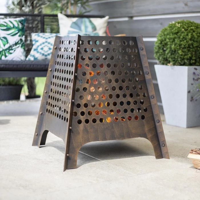 This contemporary brazier fire basket is ideal for those late summer nights sitting in the patio. Its unique and interesting dotted design is both practical and aesthetically pleasing. The dots allow air to circulate amongst the logs providing a better fire for longer, whilst the industrial metal basket creates a show stopping piece. Finished in a bronze colour, this fire basket will complement any exterior area.Â