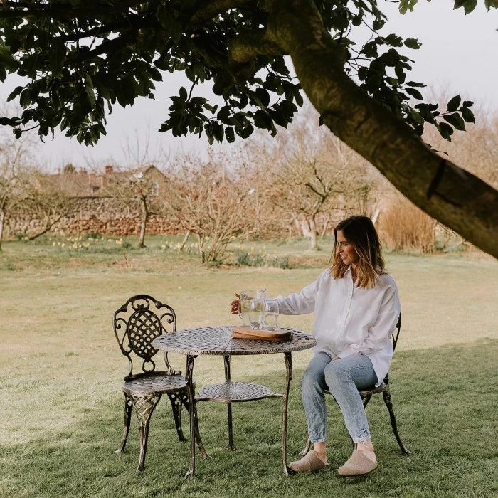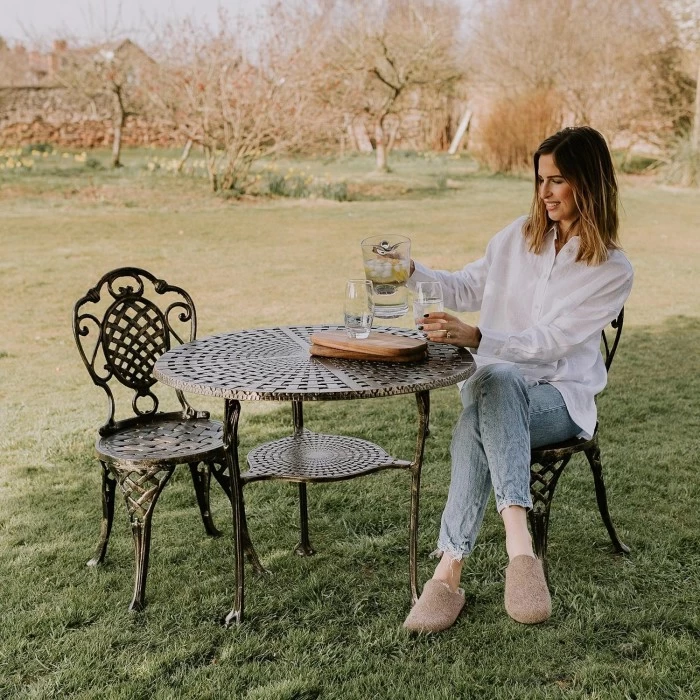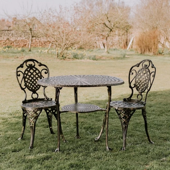 Designed and crafted from robust high quality aluminium and finished in a brushed gold, this dining set features two chairs and a circular matching table. With an intricate lattice design on the table top and also on the chair backrest and seat, this antique silver dining set adds a romantic yet practical aesthetic to your outdoor setting. Simply sit back and relax and enjoy the spring and summer months.