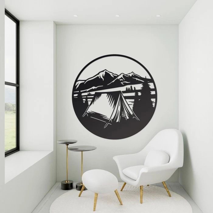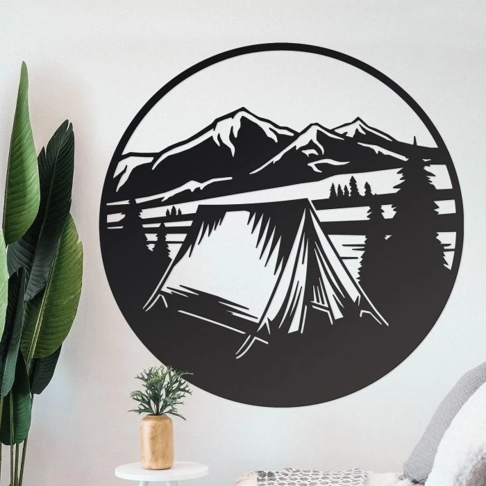 Crafted within a circular frame, this wall art depicts a mountainous scene, complete with alpine trees and a camping tent which sits central within the piece of art. Created and designed in-house, this wall art has been made using high quality robust steel and has been hand painted in a powder coated midnight black finish to protect it from the elements. Ideal placement in bedrooms, living spaces and even outdoors, this wall art comes with pre-drilled holes for easy wall mounting. A fantastic gift for campers, outdoor enthusiasts and those who simply like the quieter things in life.