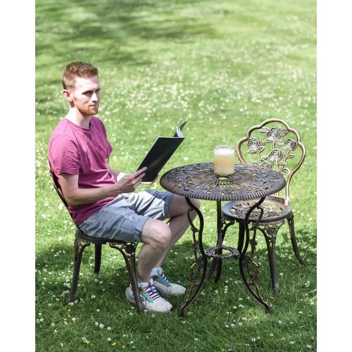 Our range of two-seater garden table and chair sets are expanded here with our “Blossom” range. Available in both an antique bronze and frosted white finish, there is an option for all different types of garden styles. This amazing set is made from a combination of high-quality cast aluminium, and iron; complete in an antique bronze finish for a well-rounded feel. This features cast iron legs, with the remaining being constructed from aluminium. With a simple design, this is easily one of our most popular designs, and would look great in your garden!
