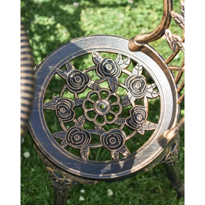 Each of the two chairs features a matching design, focusing on a collection of blossoming flowers found on both the backrest and the seat on each of the two chairs included in this bistro set. This symmetry across all three items really brings the piece together and will surely brighten up your outdoor living space.