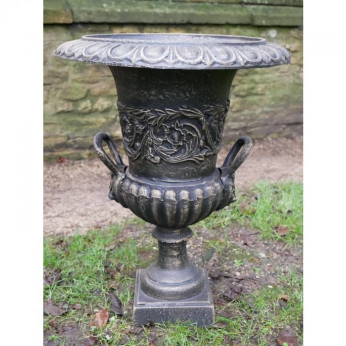 Display your favourite flowers, trailing plants and small shrubs in this beautifully simple yet elegant urn. Stand on an additional plinth for added height and impact to any garden, outdoor area or commercial space. This bronze finished cast iron urn has decorative motif of leaves and flowers spanning across the centre of the urn. Â