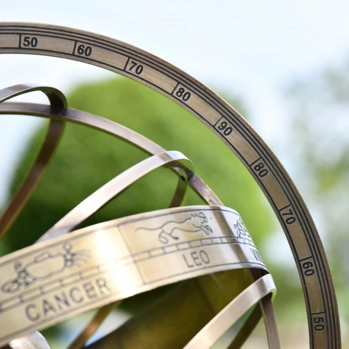 Exquisite in design and style, this beautiful armillary has been created from a brass alloy and finished in an antique bronze finish which ensures that this armillary takes centre stage in any garden or patio area. Comprising of several discs and spheres within the centre of a larger circular frame, this armillary features zodiac symbols, degree numbers and French wording of ‘A Paris Chez G. Gobille, a P Ache Royalle’.  Stood upon a matching colour base, it lifts and adds height to the armillary, allowing it to become a focal point in the desired area.