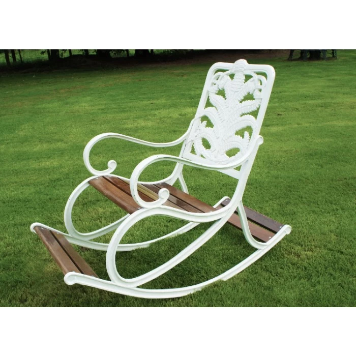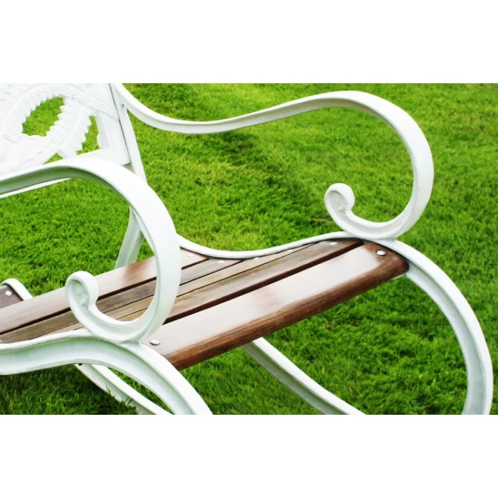 Available in your choice of a country cream, vintage green or midnight black base coat, this lovely garden rocking chair is a simply wonderful way to invite an additional layer of comfort into any outdoor setting. Crafted from robust cast aluminium and hand-painted, this chair comes complete with natural teak wood slats on its seat and footrests to ensure both comfort and stability. Featuring a large backrest adorned with delicate leaf-like motifs, two scrolled armrests, and two large curved legs to facilitate a gentle rocking motion when in use, this garden seat is the perfect way to enjoy the summer sun whilst reading a good book or magazine. This seat has been designed for one person. Please use the drop-down menu to select your desired finish.
