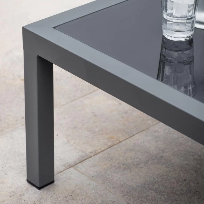 Add some modern style and character to your outdoor area with this contemporary sofa set. Consisting of a modular corner sofa, a coffee table and an armchair, this sofa set will uplift any seating area. Crafted from a lightweight weatherproof aluminium frame, the coffee table has been crafted with a smoky glass top for that added sophisticated appearance. Complete in a charcoal finish, this garden seating set includes matching-coloured cushions for support and comfort whilst in use. This contemporary garden seating set is ideal for larger families or for those who love to entertain in the spring and summer months.
