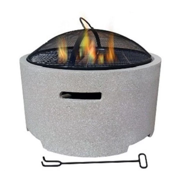 Enjoy the spring and summer nights in style with this fantastic circular stone effect fire pit. Complete with an integrated chrome cooking grill, this firepit is ideal for keeping a small group of friends and family warm, cosy and fed. A stunning yet simply designed firepit, it does not skimp on safety as it includes a wire mesh dome lid and a lifting tool for when the firepit is ablaze. Â Ideal for smaller gardens or patios.