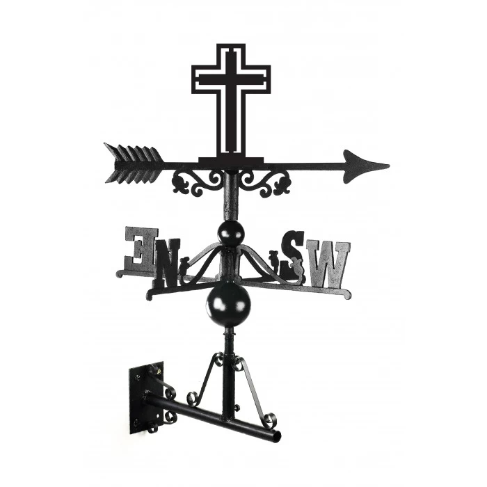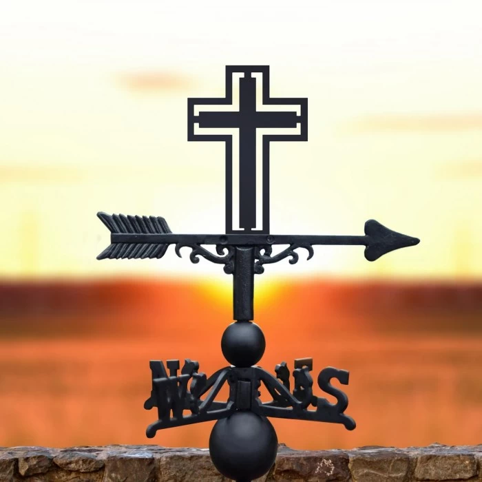 Designed for those with religious roots, this unique weathervane features the image of a cross and would look perfect fitted to the exterior of a home or property used for worshipping practices. Crafted from a combination of steel and robust cast iron, this weathervane has been finished in a sleek midnight black to complement any outdoor setting and would look ideal fitted to a wall, roof-top or large shed. Supplied with a universal bracket for easy horizontal or vertical mounting, this weathervane also features a traditional fletched arrow and directional arms for true authenticity. Perfect for showcasing your religious pride!