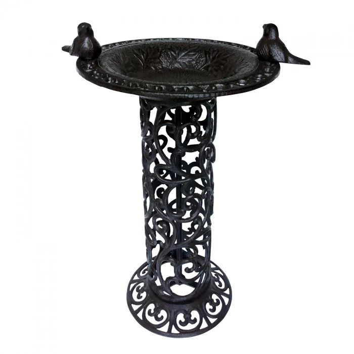 Iron has been expertly cast into this ornate vine-patterned plinth that showcases the smart bird bath on top. Black paint finishes this decorative and practical item that will welcome a variety of feathered friends into your outdoor space for many years to come. Stand it somewhere you can see from a window to enjoy the visiting birds all year round.Â