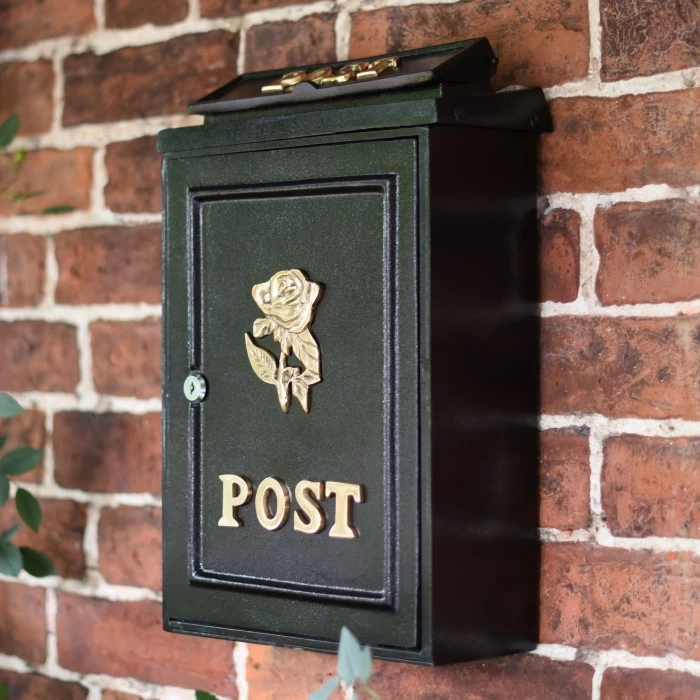 Suitable for wall or pillar mounting, this beautifully stylish post box has been fitted with a solid deluxe polished brass rose motif and ‘POST’ lettering. Complete with a large top-set letter flap and a lockable front door, this post box is designed for mail safety and will easily take an A4 envelope. Crafted from heavy-duty metal and finished in a sleek midnight black, this charming post box will add style and practicality to your property exterior for many years to come.