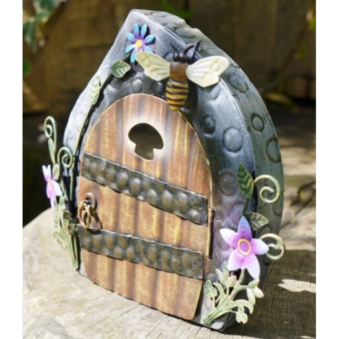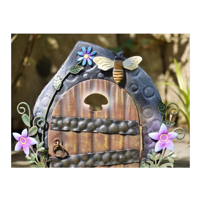 Invite a sense of enchantment to your garden space with this charming fairy door ornament. Made from sheet metal and hand finished in a variety of colours and shades, this fairy door would look perfect perched amongst a flower bed. This piece comes complete with a functioning ‘door’ and handle, floral detailing and a bumblebee accent. The perfect way to add a little sparkle of magic to your outdoor space.