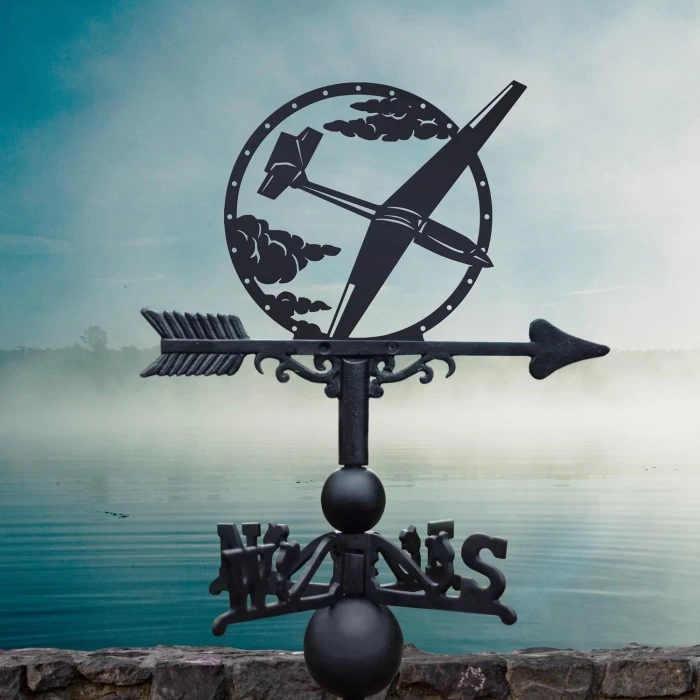 Known for their ability to remain airborne without the need of power, this quirky weathervane features the image of a glider plane soaring through the clouds encased within a circular frame. Finished in a sleek midnight black to highlight each detail of the glider’s wings and shape, this weathervane is the perfect garden accessory for any aircraft enthusiast out there. Crafted from a combination of solid cast iron and thick steel, this weathervane comes complete with a universal bracket, fletched arrow and directional arms for easy wall or roof mounting. Simply place on the exterior of any property against the backdrop of a sky to create an instant sense of character within your outdoor space.