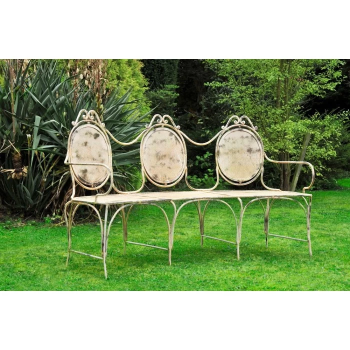 Available in your choice of a rustic cream or antique grey base coat, this stunning bench takes its inspiration from traditional Victorian boudoirs and is the perfect way to add a touch of vintage charm to any outdoor setting. Handcrafted from wrought iron, this bench comes complete with a large backrest adorned with three oval-shaped motifs and delicate scrolls throughout its outer framework, two integral curved armrests, and eight legs to ensure maximum stability during use. Designed to comfortably seat up to three people, this lovely bench is perfect for summer afternoons spent out in the garden with family and friends. Also perfect when paired with a matching table to create the ideal alfresco dining or tea party setting!