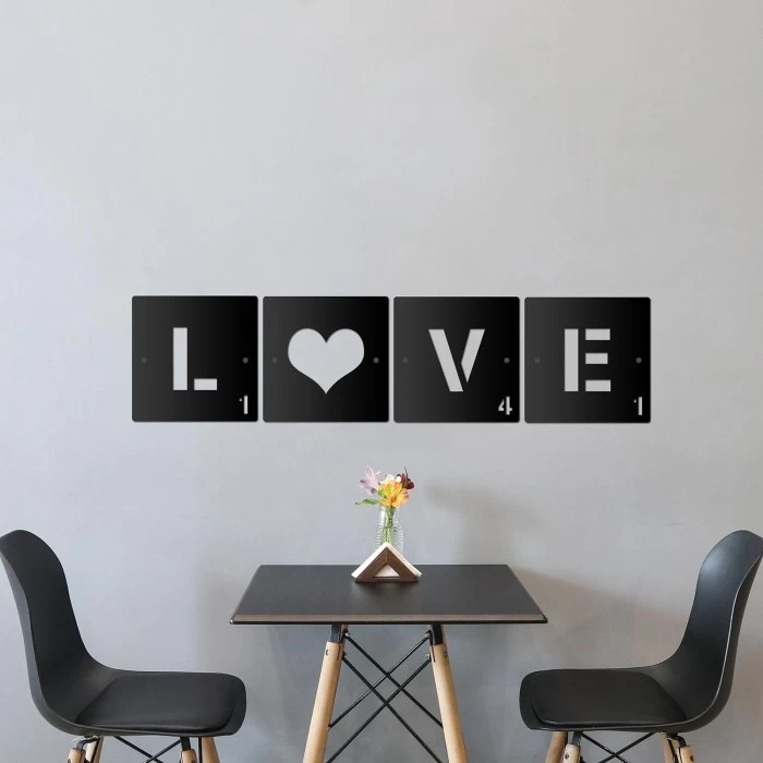 Inspired by the much-loved board game ‘Scrabble’, this quirky set of four square letters spells out the word ‘LOVE’ with the ‘O’ forming the shape of a heart. Expertly crafted from robust steel and finished in a sleek midnight black to complement any interior setting, this collection of wall art would look ideal placed within a lounge, dining room, or bedroom setting. The perfect finishing touch for any quirky family home out there, this wall art will add charm to your chosen space for many years to come. These squares can be left freestanding or, alternatively, they can be attached to a surface via a strong adhesive or screws.