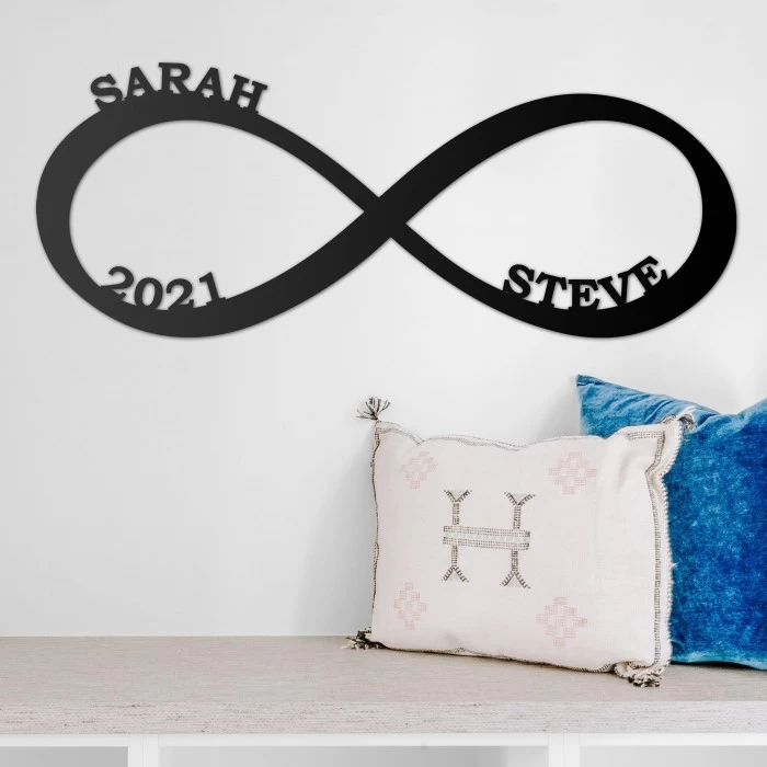 The infinity loop is a never-ending continuous loop which has no start or end. Depicted to represent the promise of ‘till death do us part’, the infinity loops is a popular gift for couples, newlyweds or for valentines day. Crafted from high quality steel and finished in a powder coated midnight black finish, this wall art can be wall mounted to either indoor or outdoor living spaces. Fully customisable, this wall art can have up to two names and a date, if required. A fun and quirky wedding gift.