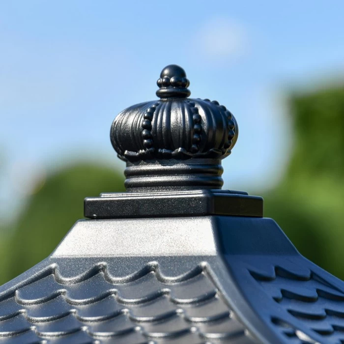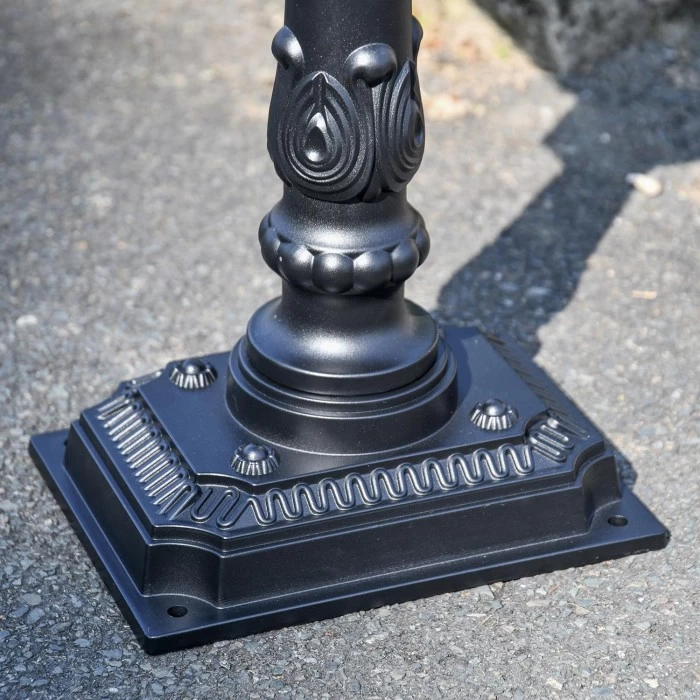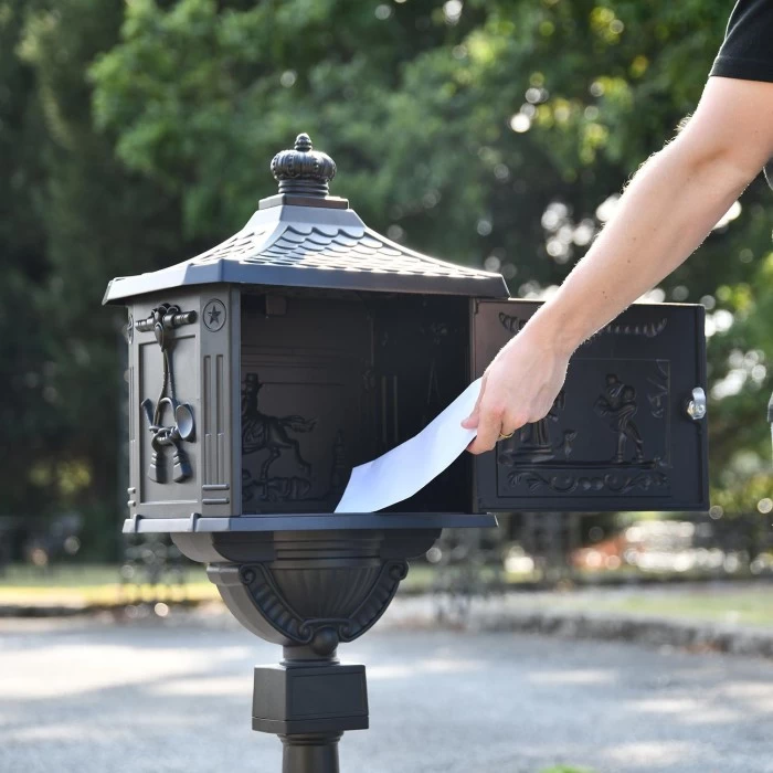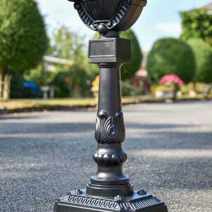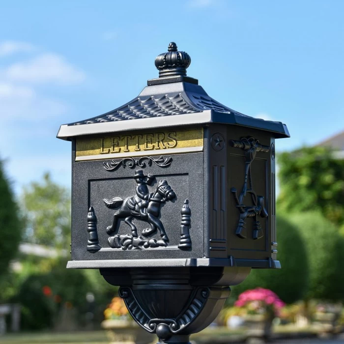 Set on a turned pillar, this post box has a striking and period look with a detailed and sculptured top box, all set on a splendid column. Cast in aluminium, the Huntingdon is a new addition produced with a brass letter flap and striking matt black finish and detailing.Â