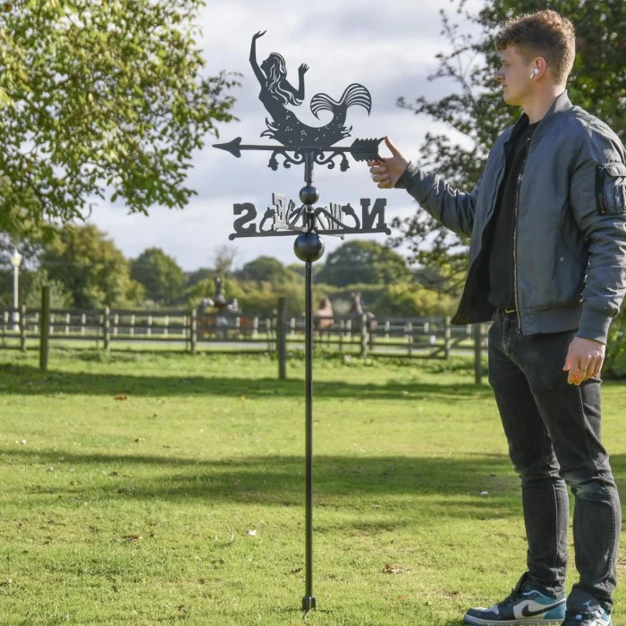 Crafted from cast iron and high-quality steel, this weathervane features a Mermaid topper. Complete in a black powder coating, equipped with directional arms, and ground spikes that add stability and support during use. Freestanding weathervanes such as this one is a must-have accessory for those who want to add beauty to their garden, without the need to drill holes. A perfect gift for any fantasy or mythical enthusiast!