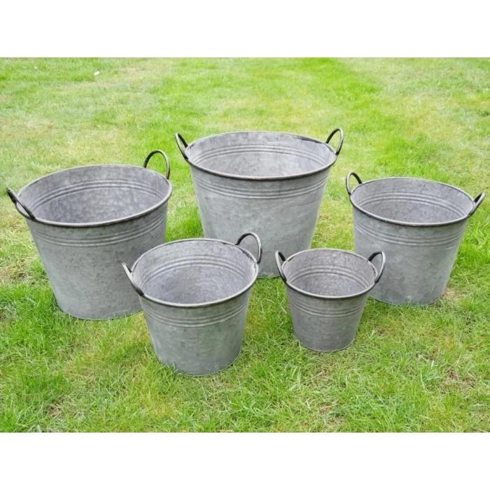 Crafted from high quality metal and left to naturally age, these set of five outdoor planters are the perfect garden accessory and can be placed in patios, pathways or in flowerbeds. Each of the planters feature two integrated handles for easy manoeuvring from location and location, perfect for when cutting grass or trimming hedges. Simple in design, with small ridges, each planter will complement any garden style or colour scheme.