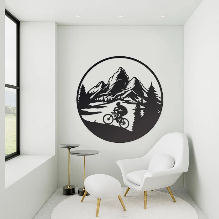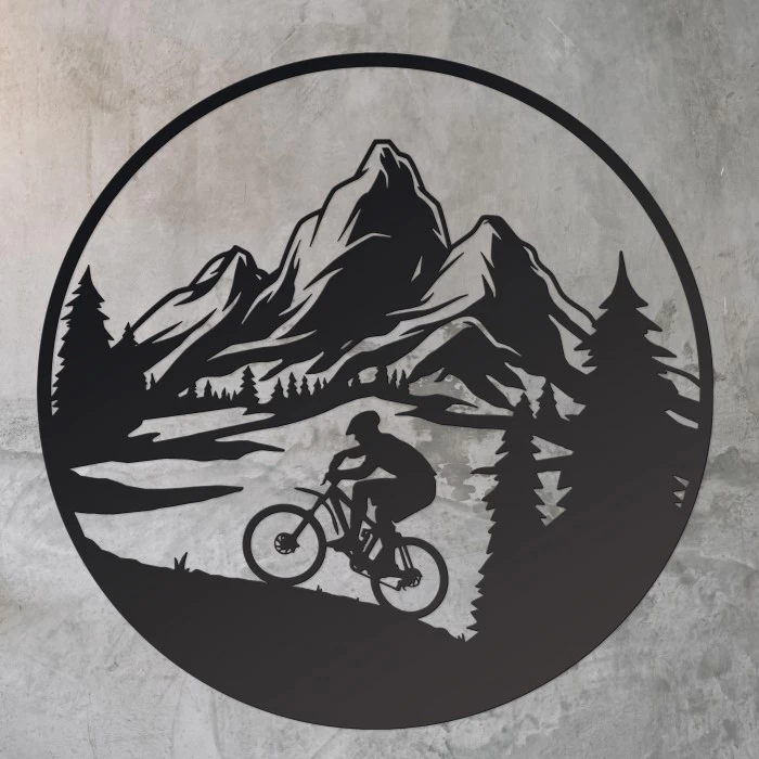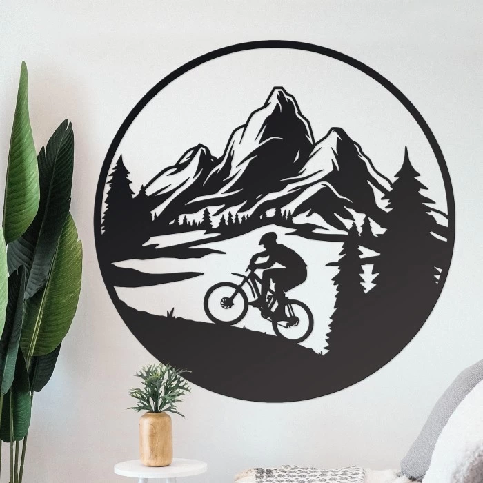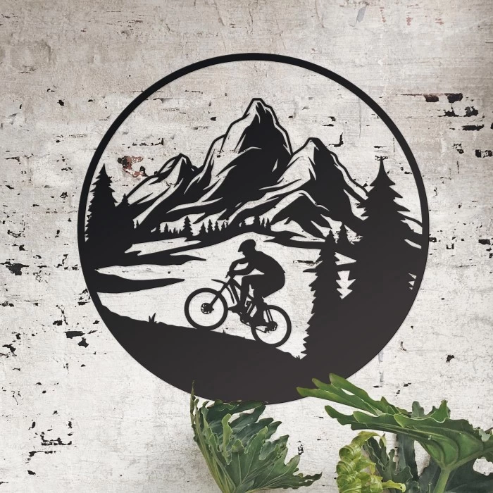 Created within a circular frame, this wall art is a fantastic gift for anyone who loves venturing outdoors on their mountain bike. Featuring a mountainous scene, complete with alpine trees, a mountain bike rider makes his way up the steep surfaced. Created from high quality robust steel and finished in a sleek midnight black finish, this wall art can be placed either indoors or outdoors. With pre-drilled holes within the piece, it makes for easy installation to the desired wall, fence or area.