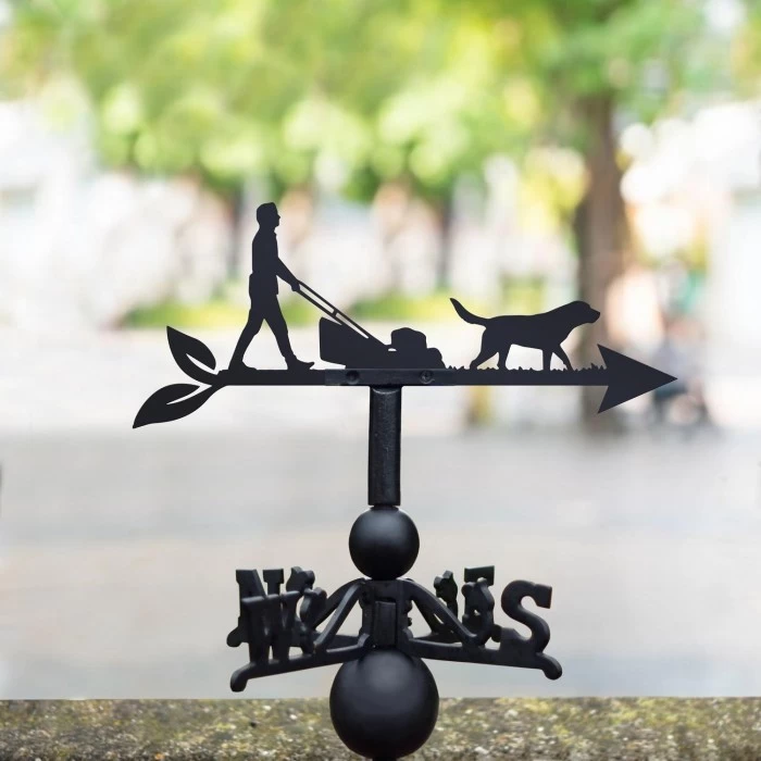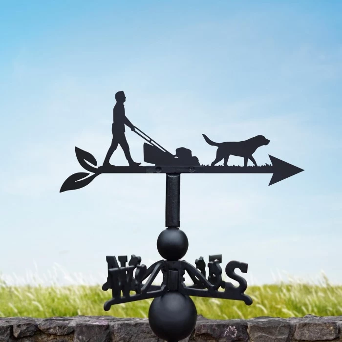 As if mowing the arrow itself, this wonderful weathervane depicts a man mowing the lawn following a Labrador retriever. The fletched arrow has converted into a beautiful two leaf design which adds to the sense of outdoors and garden work. Crafted and designed by our in-house team, this beautiful weathervane has been crafted using a combination of robust steel and cast iron, all finished in a powdered midnight black finish for durability and sustainability. Complete with universal horizontal and vertical bracket, fixings and directional arrows, this weathervane is just perfect when added to the top of roofs, sheds or garages. A must for those who have Labradors and love to go garden work.