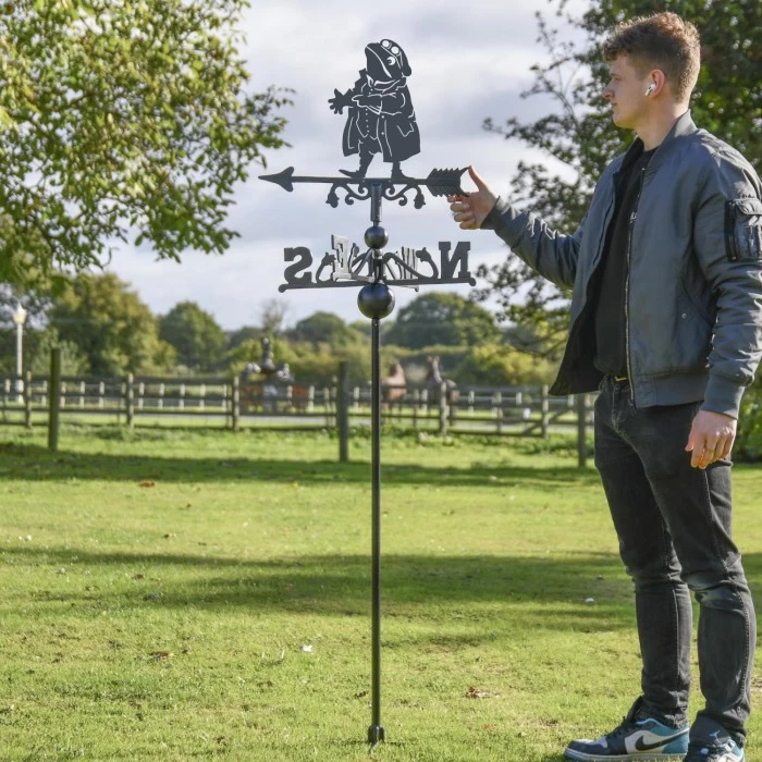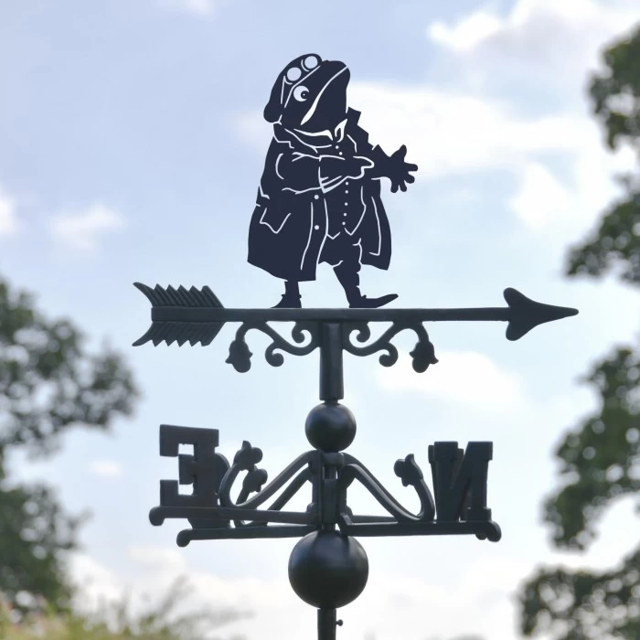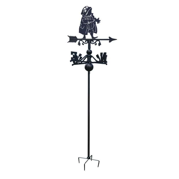 Crafted from cast iron and high-quality steel, this weathervane features a detailed Mr Toad topper. Complete in a black powder coating, equipped with directional arms, and ground spikes that add stability and support during use. Freestanding weathervanes such as this one is a must-have accessory for those who want to add beauty to their garden, without the need to drill holes. A perfect gift for any fan of the Wind in the Willows!