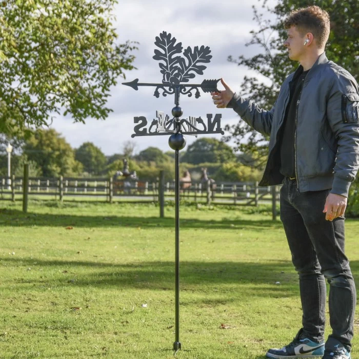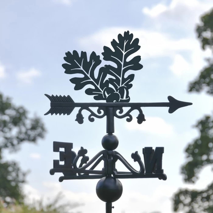 Show off your love of nature with this wonderful freestanding Oak Leaves weathervane. Crafted from cast iron and high-quality steel, complete in a black powder coating, equipped with directional arms, and ground spikes that add stability and support during use. Freestanding weathervanes such as this one is a must-have accessory for those who want to add beauty to their garden, without the need to drill holes.