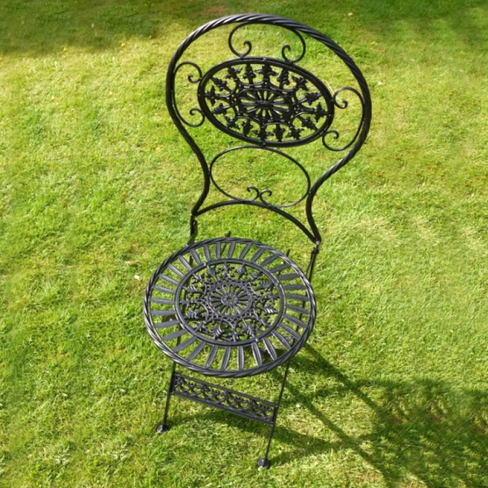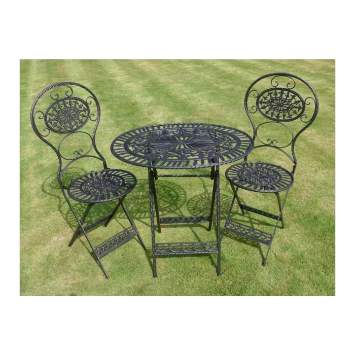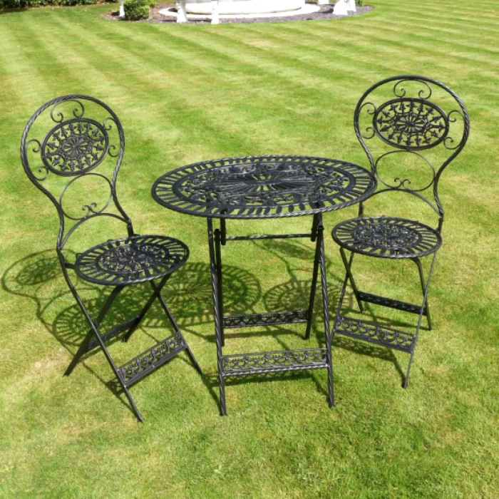 Despite its delicate design, this gorgeous table and two chairs, is made from wrought iron and finished in a beautiful midnight black colour, making it robust and strong for years of reliable service. Perfect furniture set for afternoon tea or morning coffee sat outside. This set also folds away with ease for storage in the colder months.