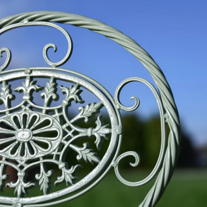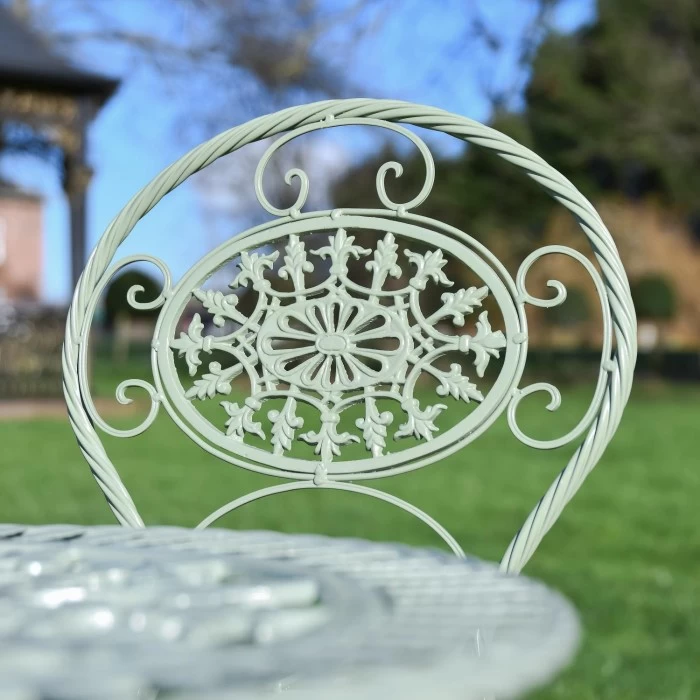 Made from metal this garden furniture set comprises of four chairs and a single table in a pale green finish. Its pastel colouring will complement any garden or patio area and with its romantic scroll and flower design, it can be used throughout the year.