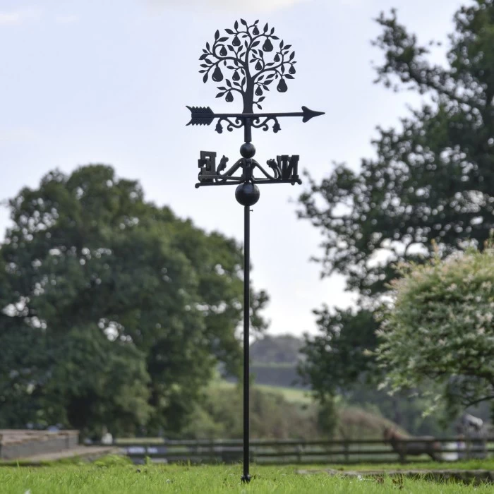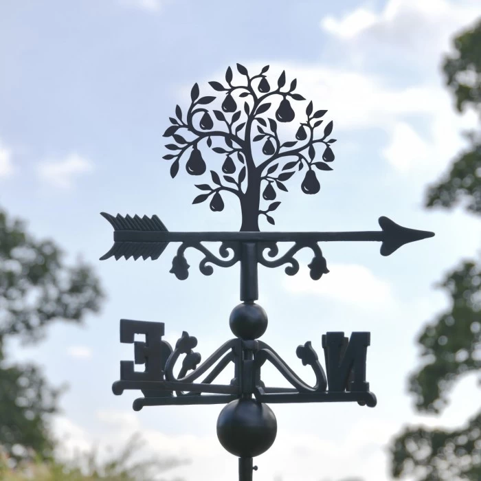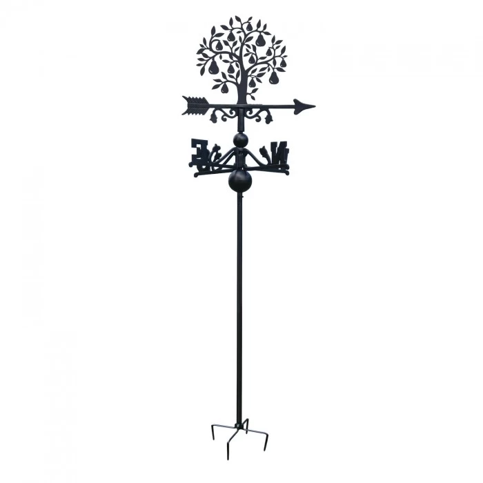 Crafted from cast iron and high-quality steel, this weathervane features a detailed Pear Tree topper. Complete in a black powder coating, equipped with directional arms, and ground spikes that add stability and support during use. Freestanding weathervanes such as this one is a must-have accessory for those who want to add beauty to their garden, without the need to drill holes. A perfect gift for any nature and outdoor lover!