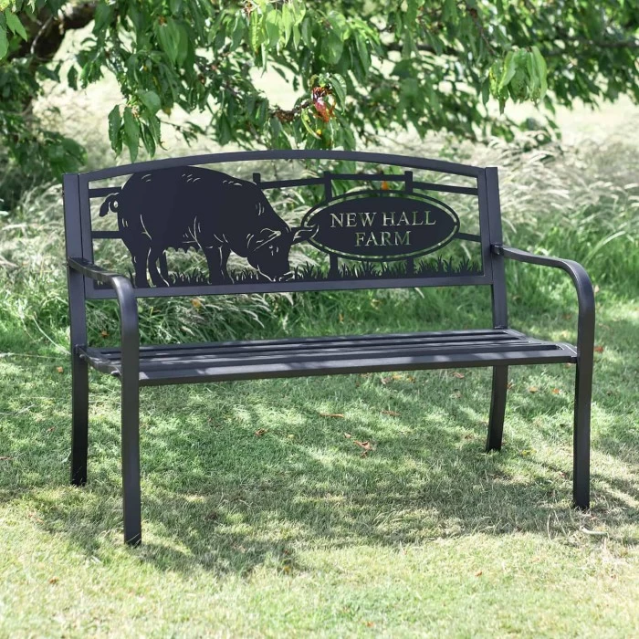 Made from a combination of robust iron and steel, this bespoke park bench is complete in a matte black base coat finish. Expertly handcrafted and designed by our in-house team, the bench backrest features a stunning design showcasing a pig, in situ on the farm exploring their secure area. With a wooden fence in the background, there is an incredible degree of accuracy in recreating a pig pen.