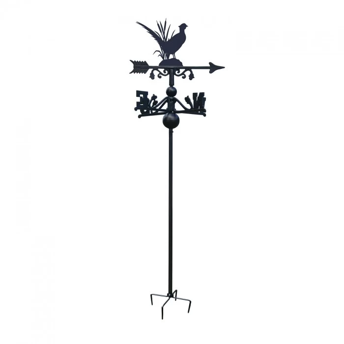 Designed and crafted by our in house team, this free standing weathervane has been created using high quality robust steel and cast iron and finished in a sleek midnight black to complement any exterior setting. Featuring a topper with Britain’s most famous countryside bird, the Pheasant, as he stands amongst foliage, it is the ideal garden accessory for those who live in the country or bird enthusiasts. Complete with directional arms, fletched arrow and four pronged feet for stability and support when in use, this weathervane is a must have for those who want the beauty and style of a weathervane without the need for installation. Â