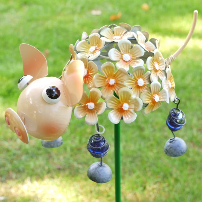 Show off this quirky garden ornament in a large planter or in your flower bed to instantly brighten up any space. Glass beads and painted sheet metal have been used to make this sweet and eye-catching pig ornament. With its cartoonish face and cheerful flower covered body, this little piggy will add charm and character to your garden or outdoor space. Conveniently mounted onto a spike so you can easily plant it in the ground.