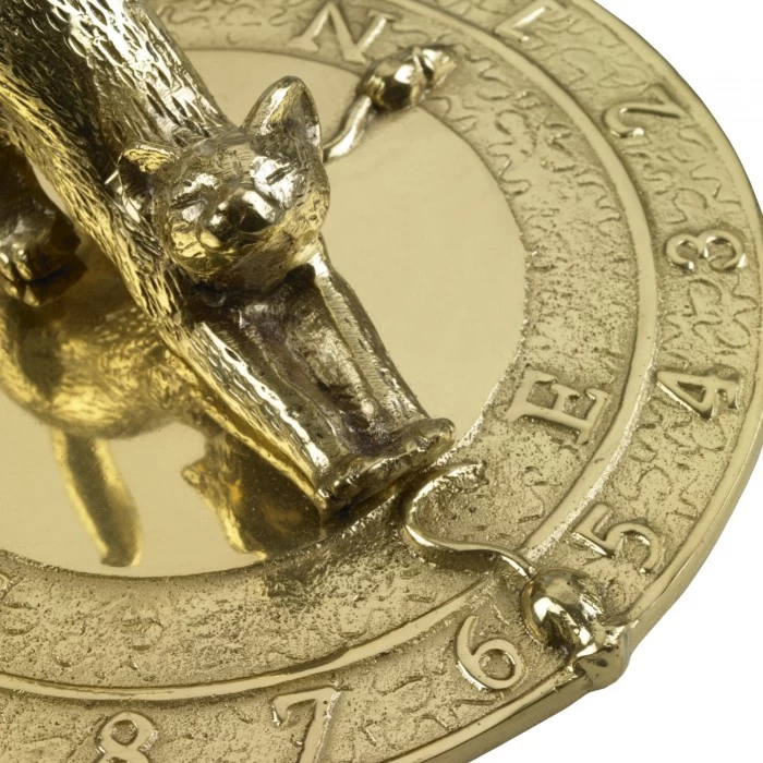 Crafted from solid brass and highly polished for a wonderful bright shine, this sundial features a directional compass and hour numerals. A matching polished brass figure of a stretching cat sits within the centre of the sundial, whilst three mice scurry away. Doubling as the gnomon, the cat’s tail sits upright adding height to the overall sundial. Beautiful etched detailing can be seen throughout the cat, adding character and charm to this decorative sundial. A wonderful addition to the garden for any cat lover or owner. Â
