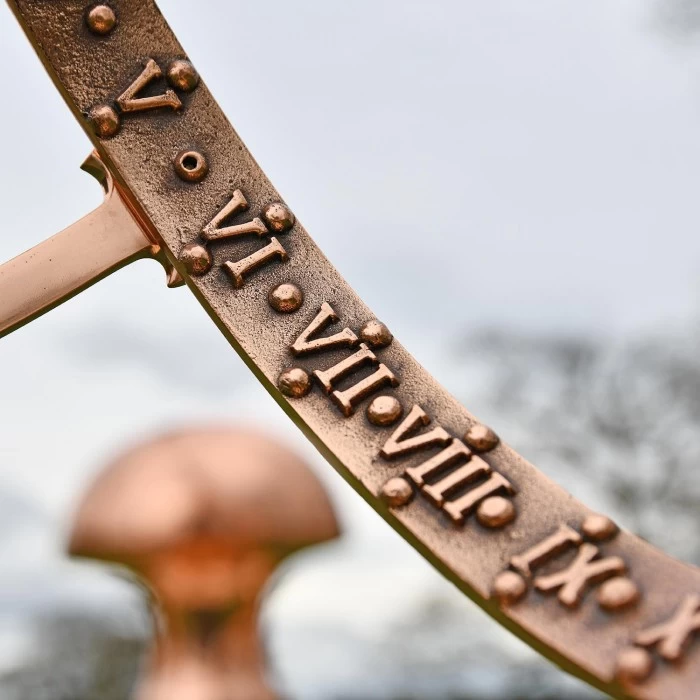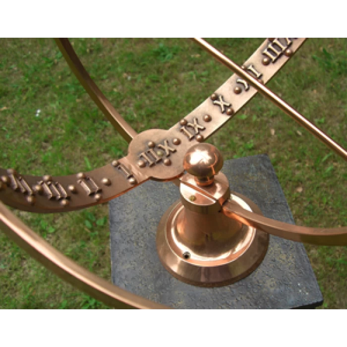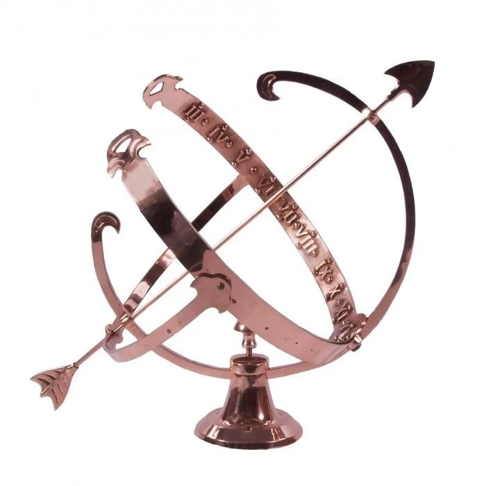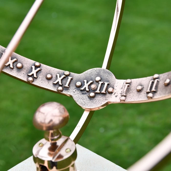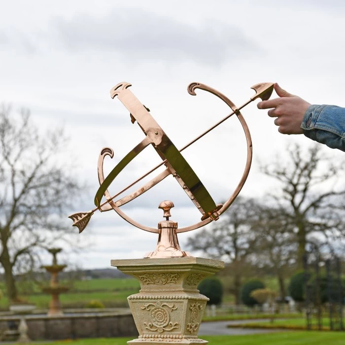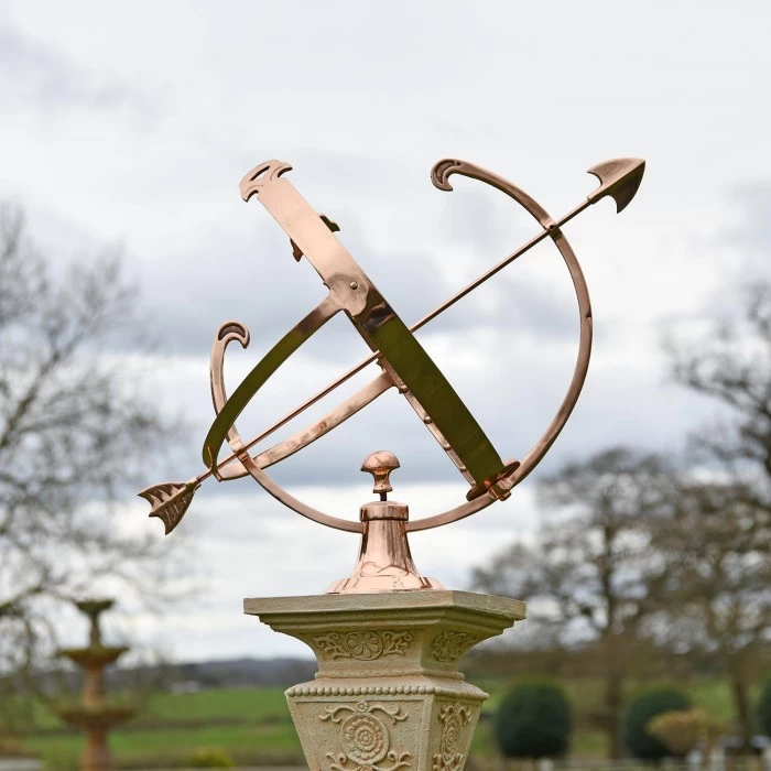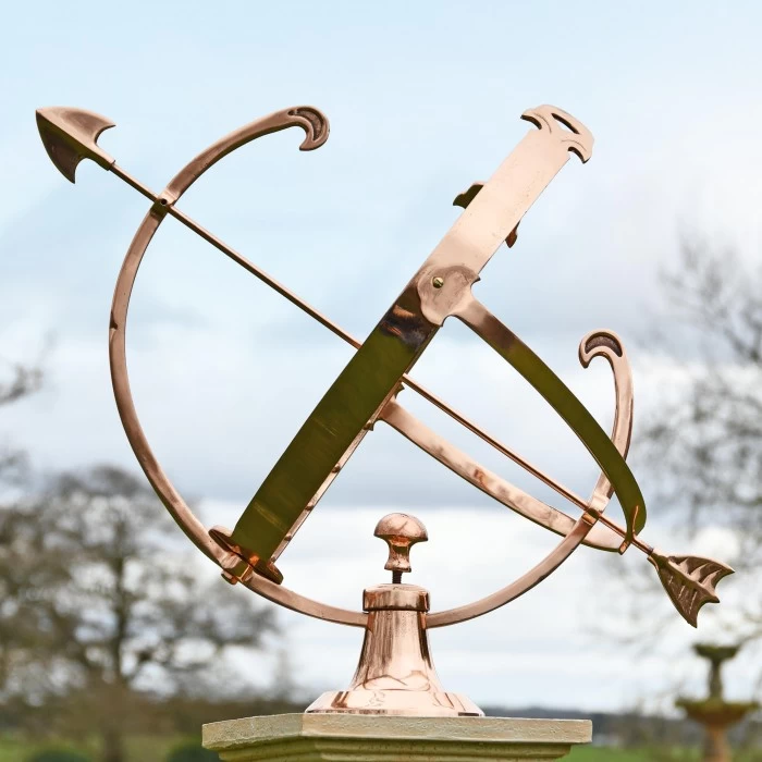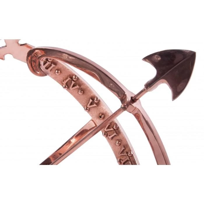 Crafted from solid copper and finished in a beautiful polished effect to highlight each intricate detail, this simply stunning garden armillary is the perfect way to invite historical charm and a sense of grandeur into any outdoor setting. Complete with a traditional fletched arrow spanning across its framework, this large design takes its inspiration from classic armillaries seen throughout history and features delicately embossed Roman numerals adorning the entirety of its inner band. Complete with three interlocking copper bands and its own integral stand to ensure stability during use, this armillary looks particularly beautiful when fitted to its own column where it will add an antique touch to your grounds throughout all seasons of the year. This armillary has been designed to sit atop a column.
